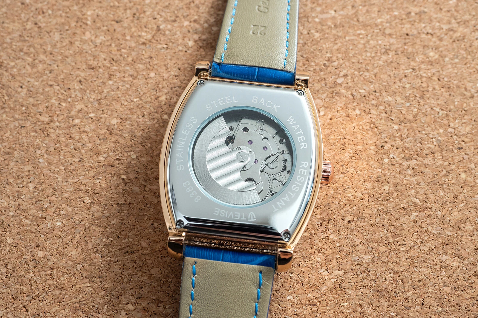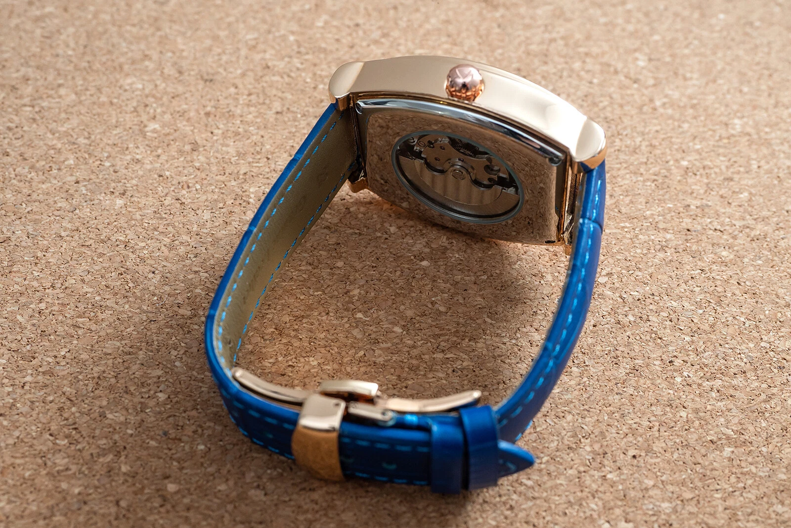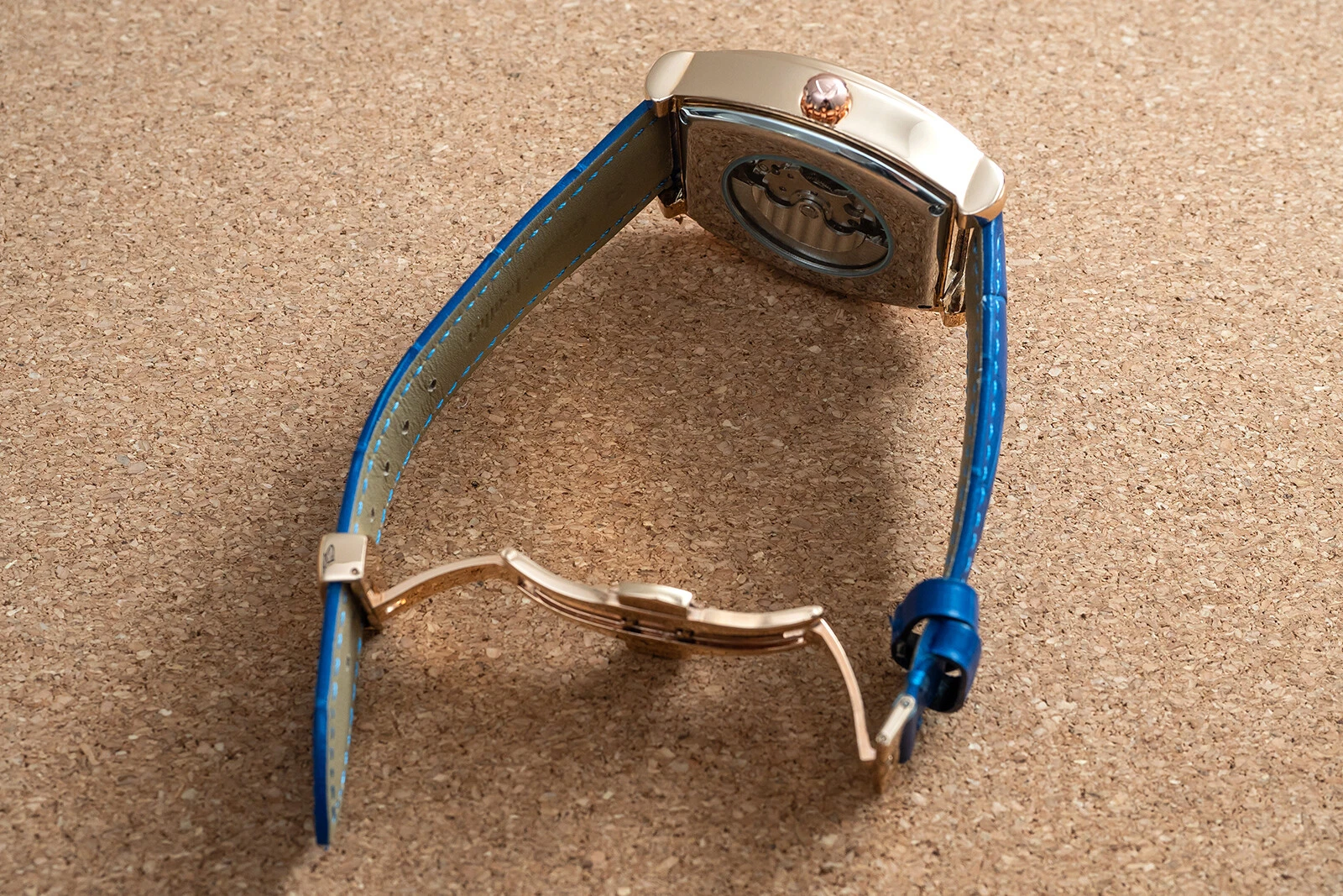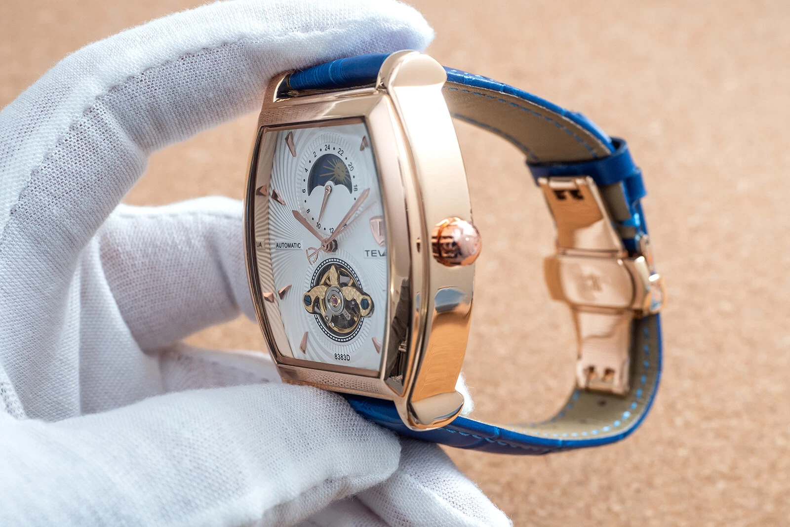 Mens Rose Gold Moon Phase Automatic Mechanical Watch Blue Leather 24HR Dial