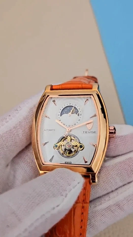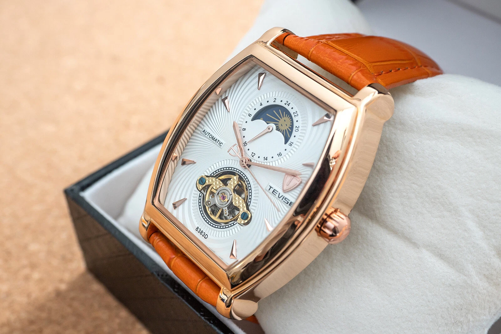 Mens Rose Gold Moon Phase Automatic Mechanical Watch Orange Leather 24HR Dial