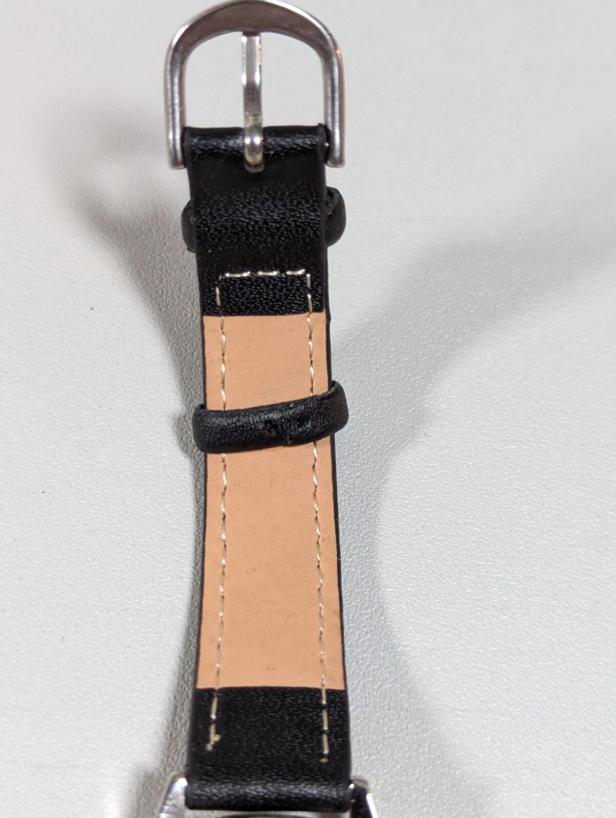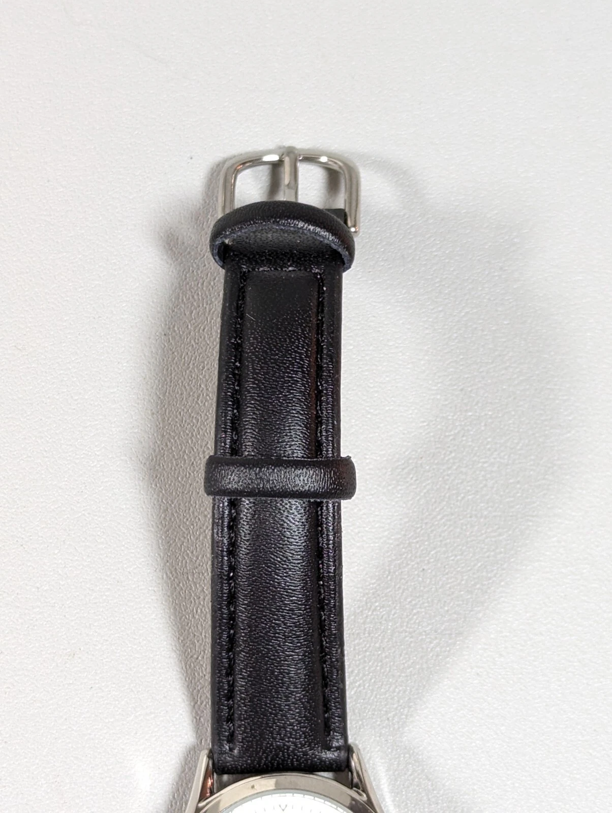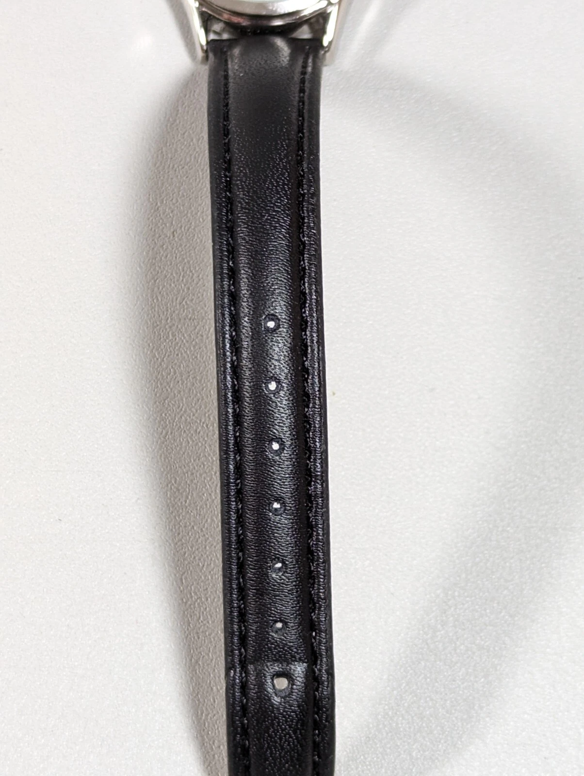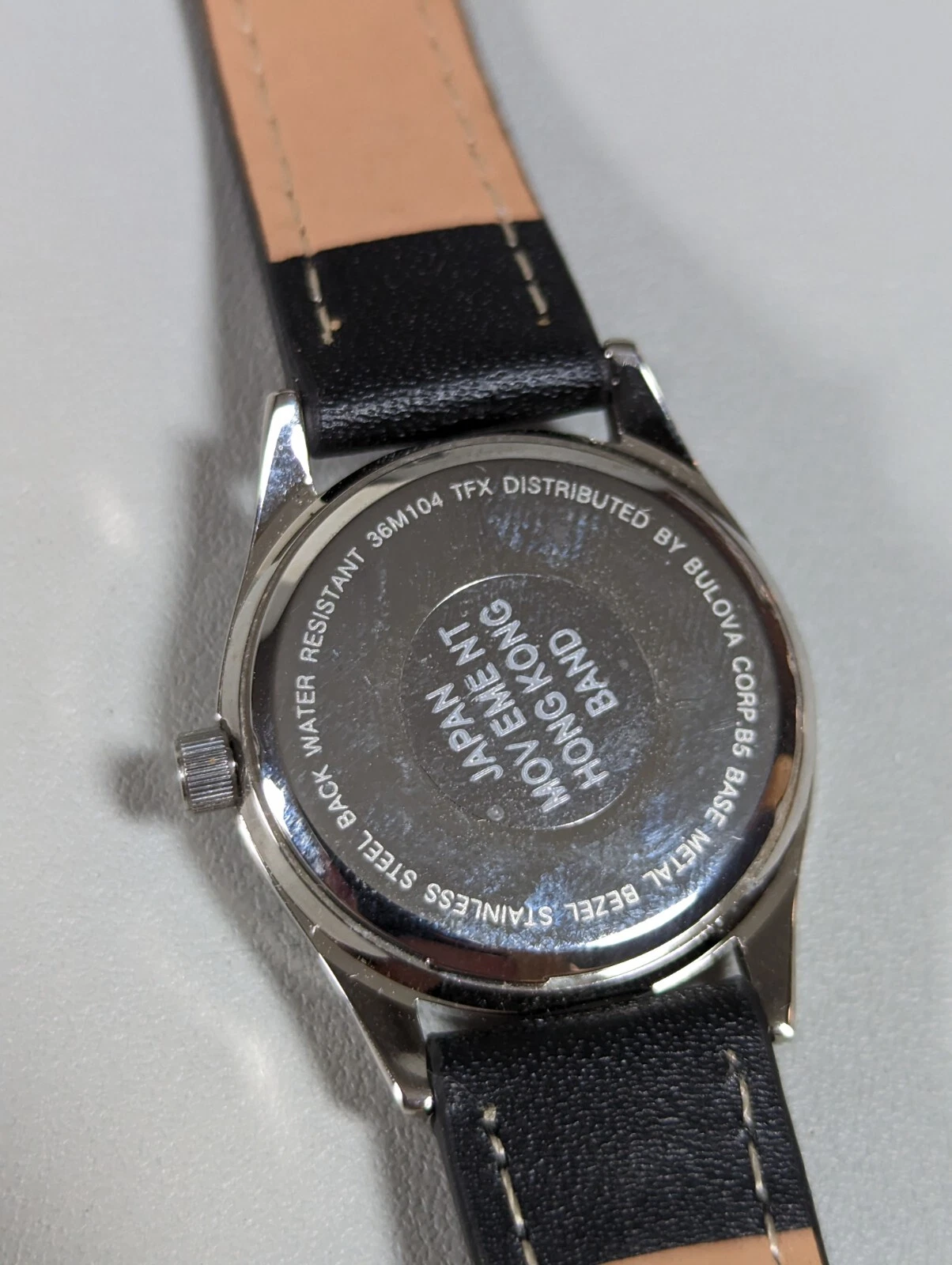 TFX Bulova White Dial Date Indicator Round Silver Tone Black Leather Band Watch