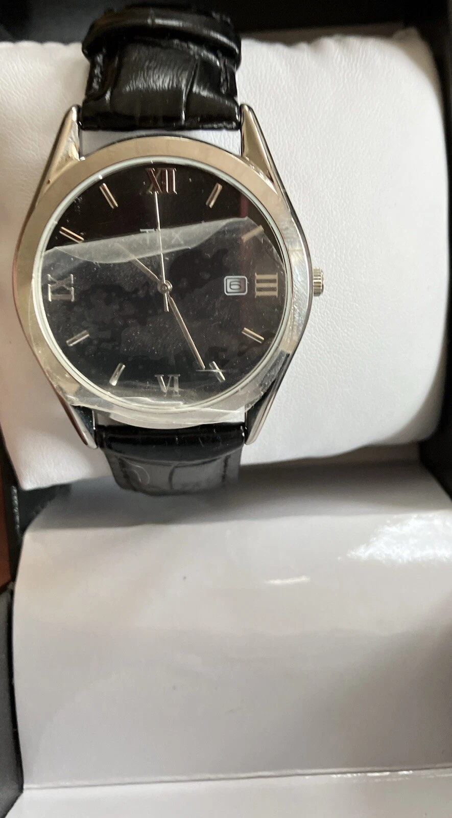 TFX Bulova White Dial Date Indicator Round Silver Tone Black Leather Band Watch