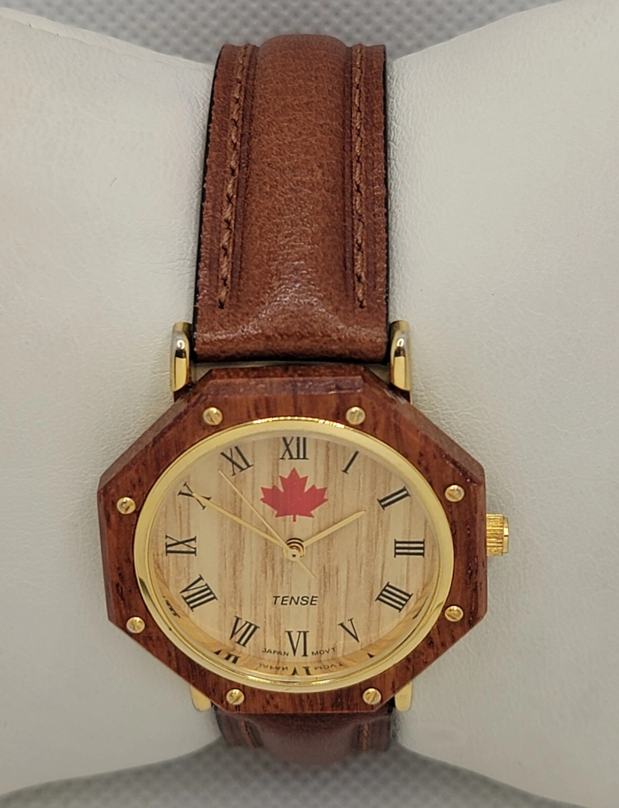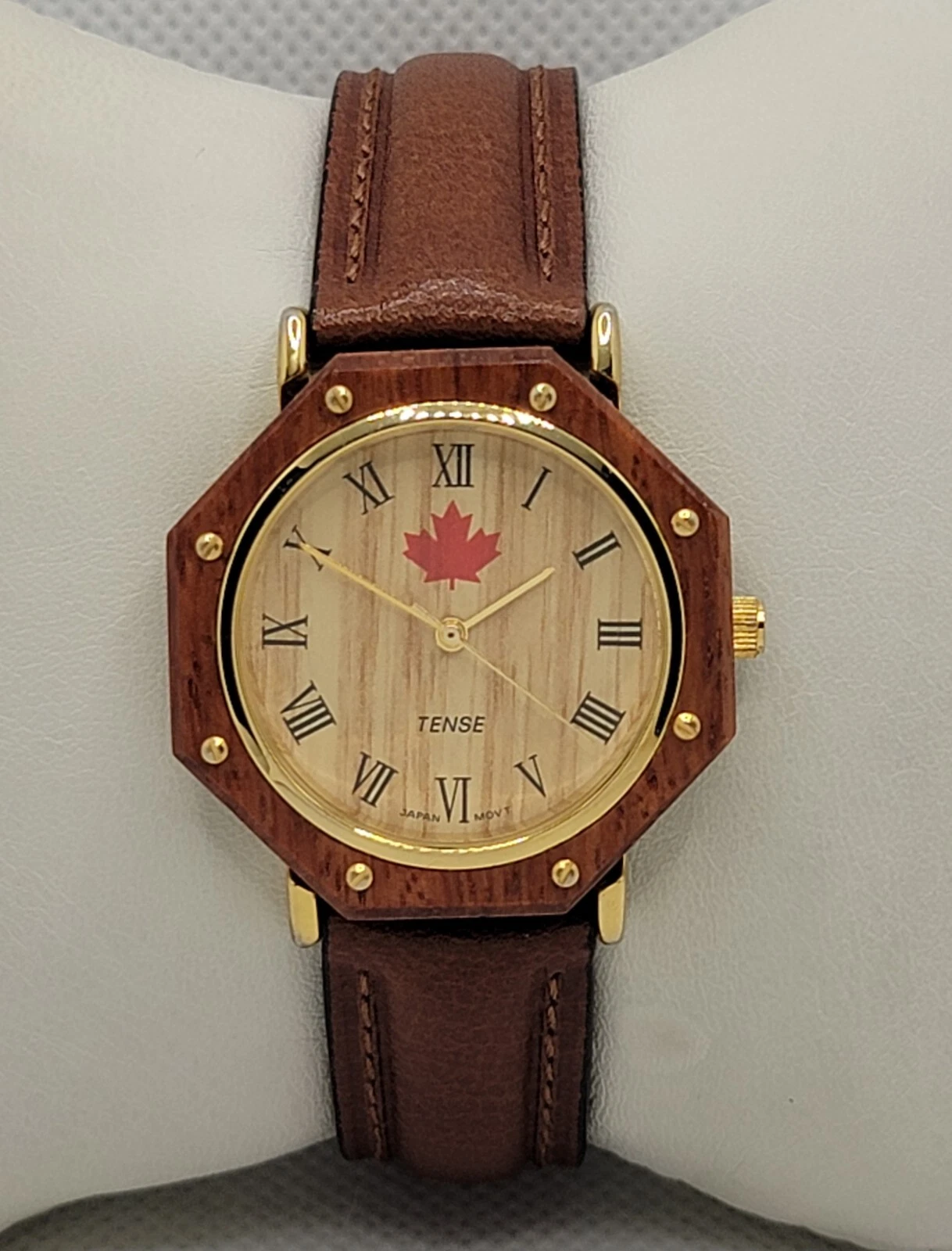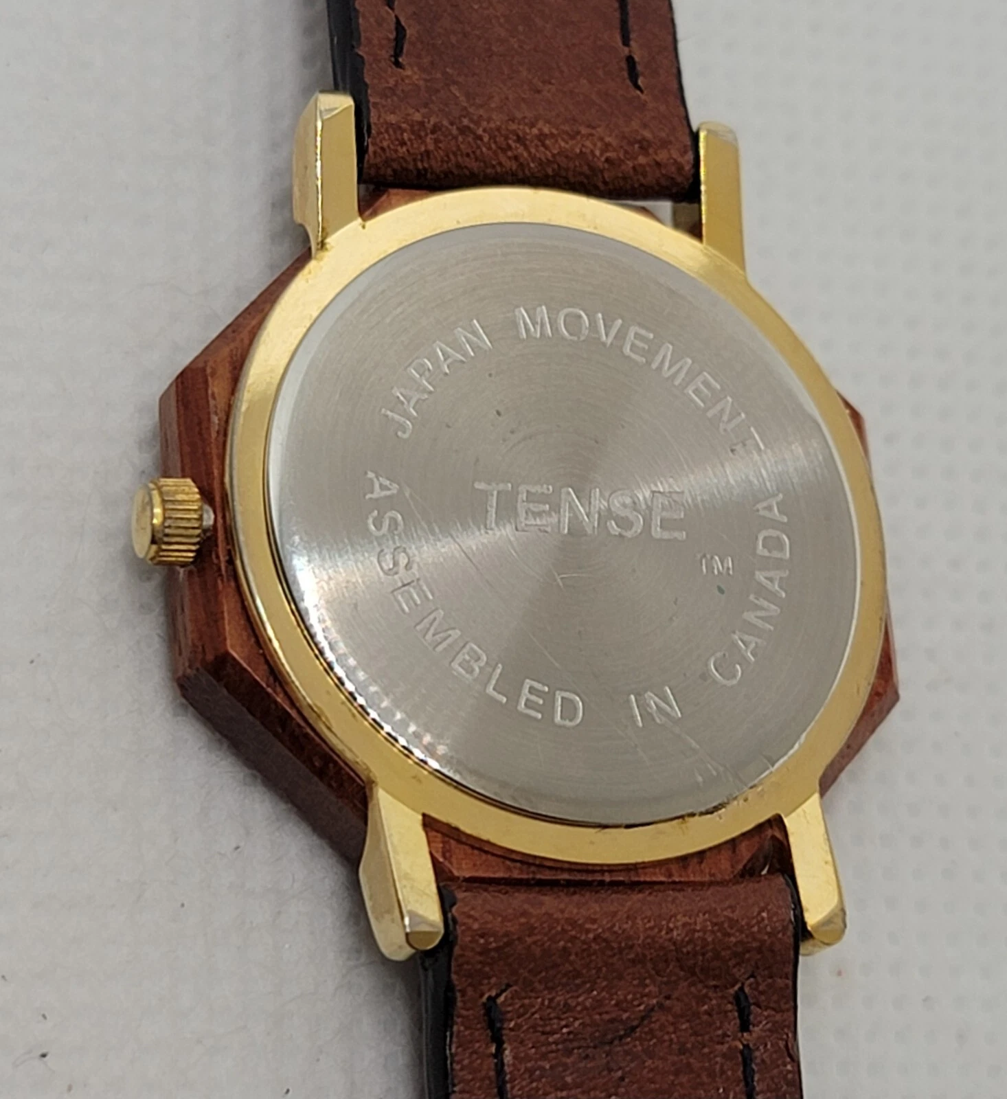 Ladies Tense Wooden Bezel Canadian Made Gold Tone Brown Leather Band Watch J4