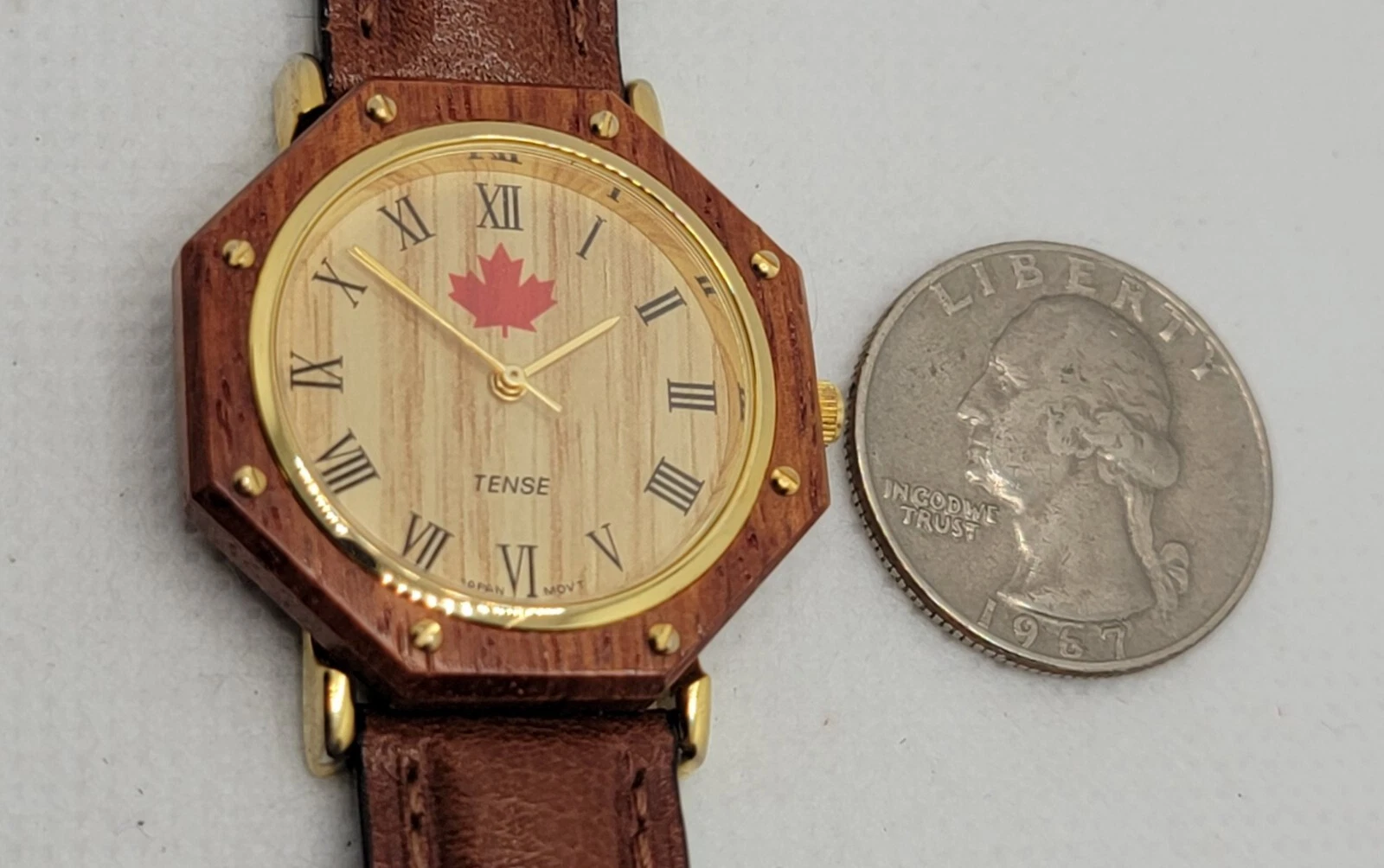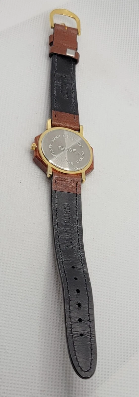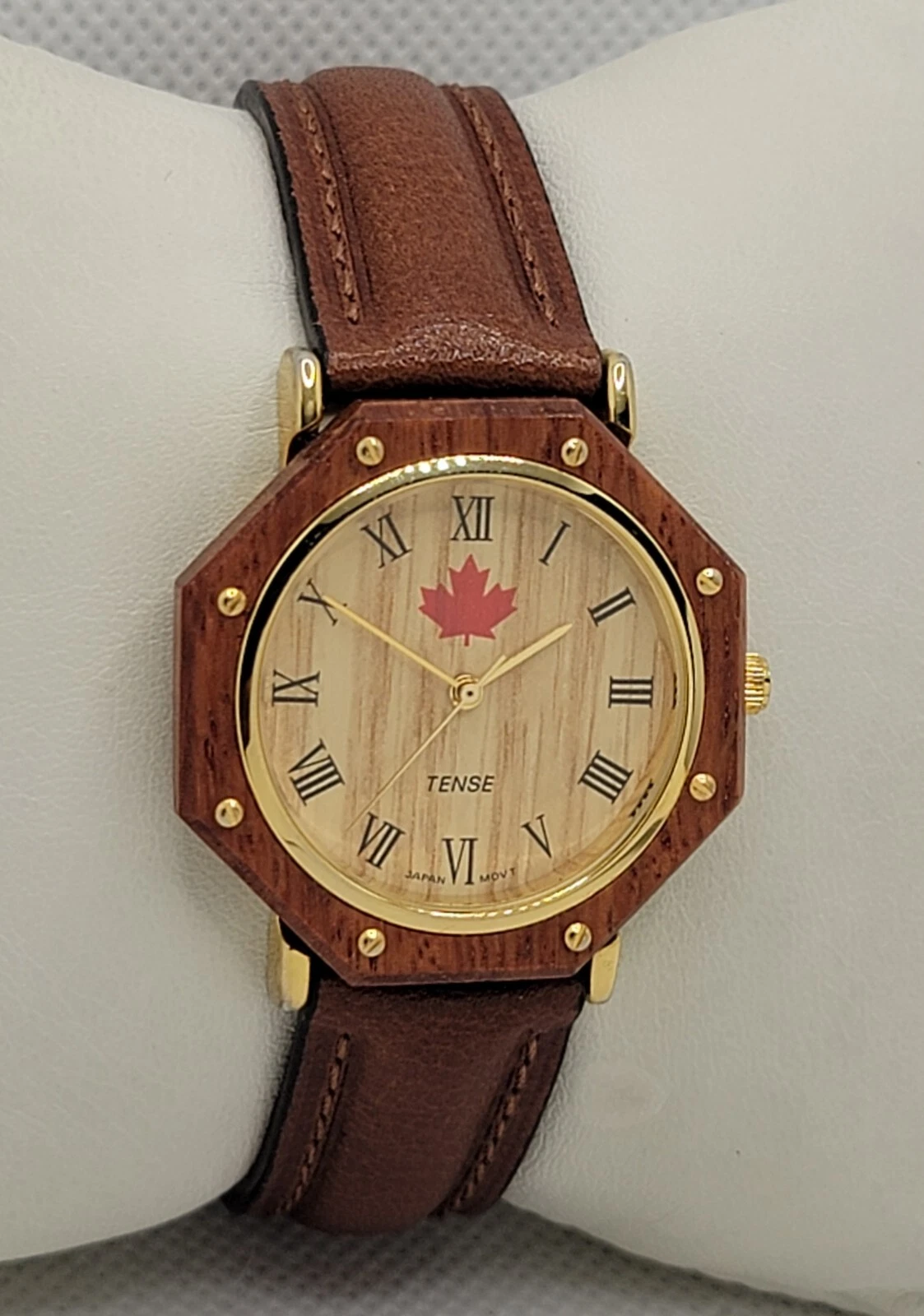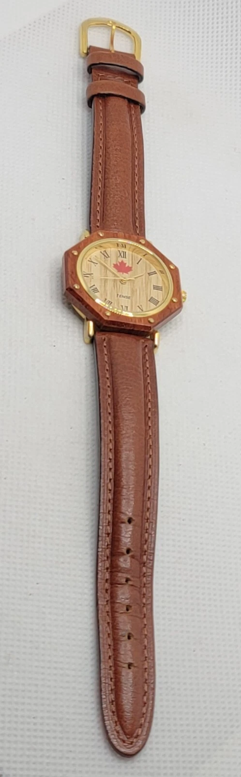 Ladies Tense Wooden Bezel Canadian Made Gold Tone Brown Leather Band Watch J4