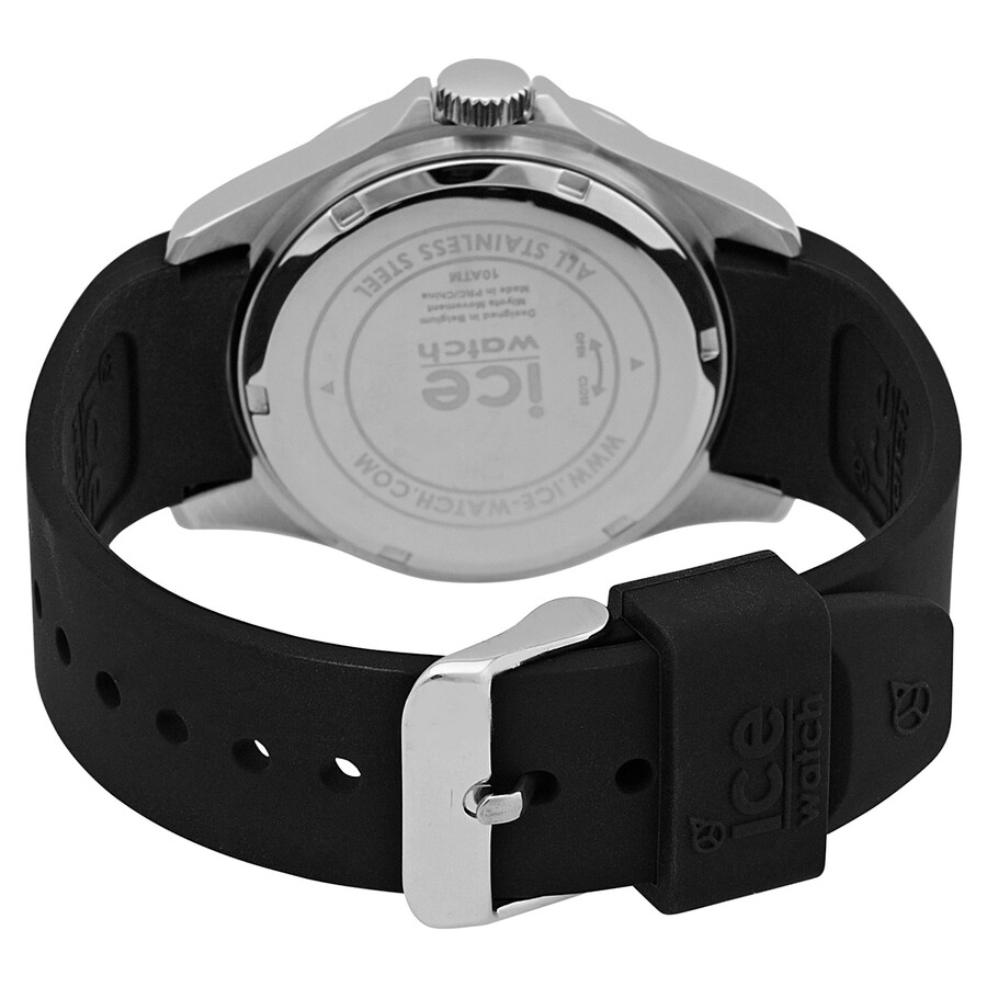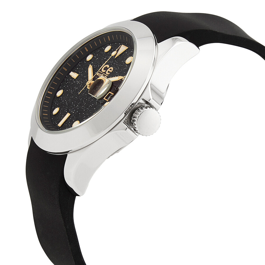 Stainless steel case with a black rubber strap. Fixed stainless steel bezel. Black glitter dial with luminous gold-tone hands and dot hour markers. Index markers appear at 3, 6 and 9 o clock positions. Minute markers around the outer rim. Dial Type: Analog. Luminescent hands and markers. Date display at the 3 o'clock position. Quartz movement. Scratch resistant mineral crystal. Pull / push crown. Solid case back. Round case shape. Case size: 40 mm. Band width: 20 mm. Tang clasp. Water resistant at 100 meters / 330 feet. Functions: date, hour, minute, second. Casual watch style. Watch label: Japan Movt. Ice-Watch Quartz Black Dial Ladies Watch 020388.