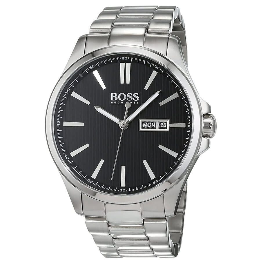 Silver-tone stainless steel case and bracelet. Fixed silver-tone stainless steel bezel. Black dial with silver-tone hands and index hour markers. Minute markers around the outer rim. Dial Type: Analog. Day of the week and date display at the 3 o'clock position. Quartz movement. Scratch resistant mineral crystal. Round case shape, case size: 44 mm, case thickness: 10 mm. Band width: 22 mm, band length: 7.5 inches. Deployment with push button release clasp. Water resistant at 30 meters / 100 feet. Functions: date, day, hour, minute, second. The James Series. Fashion watch style. Hugo Boss The James Quartz Black Dial Men's Watch 1513466.