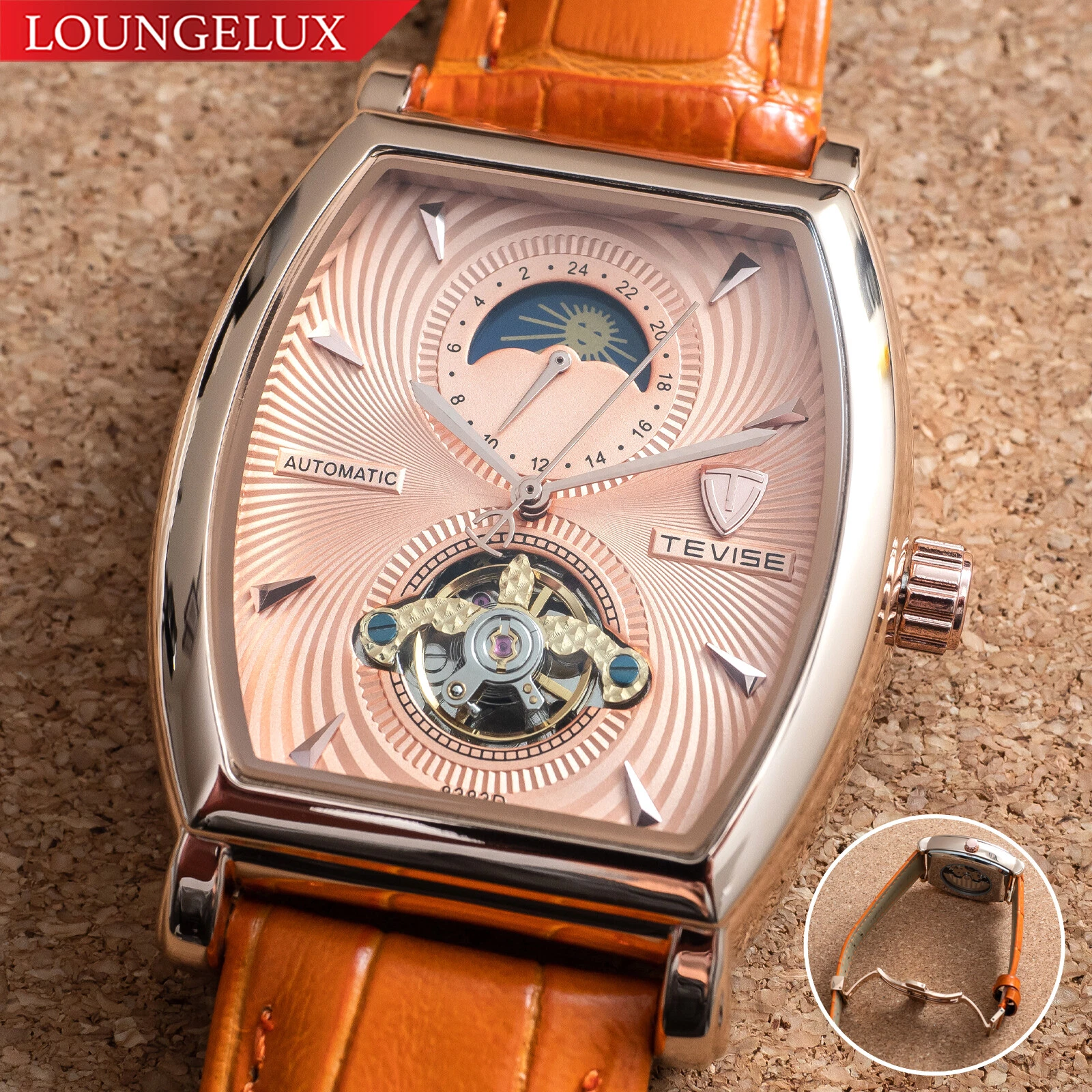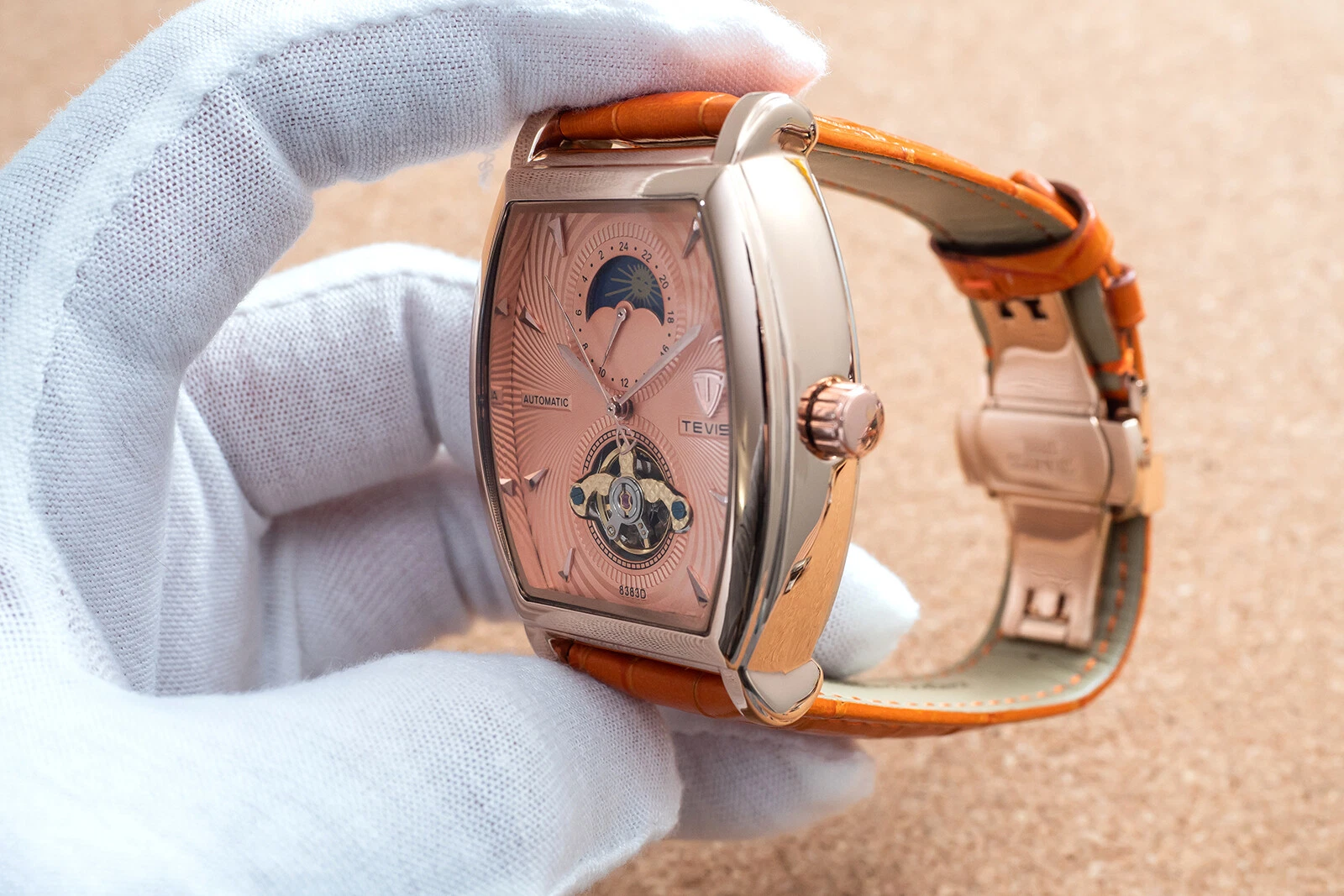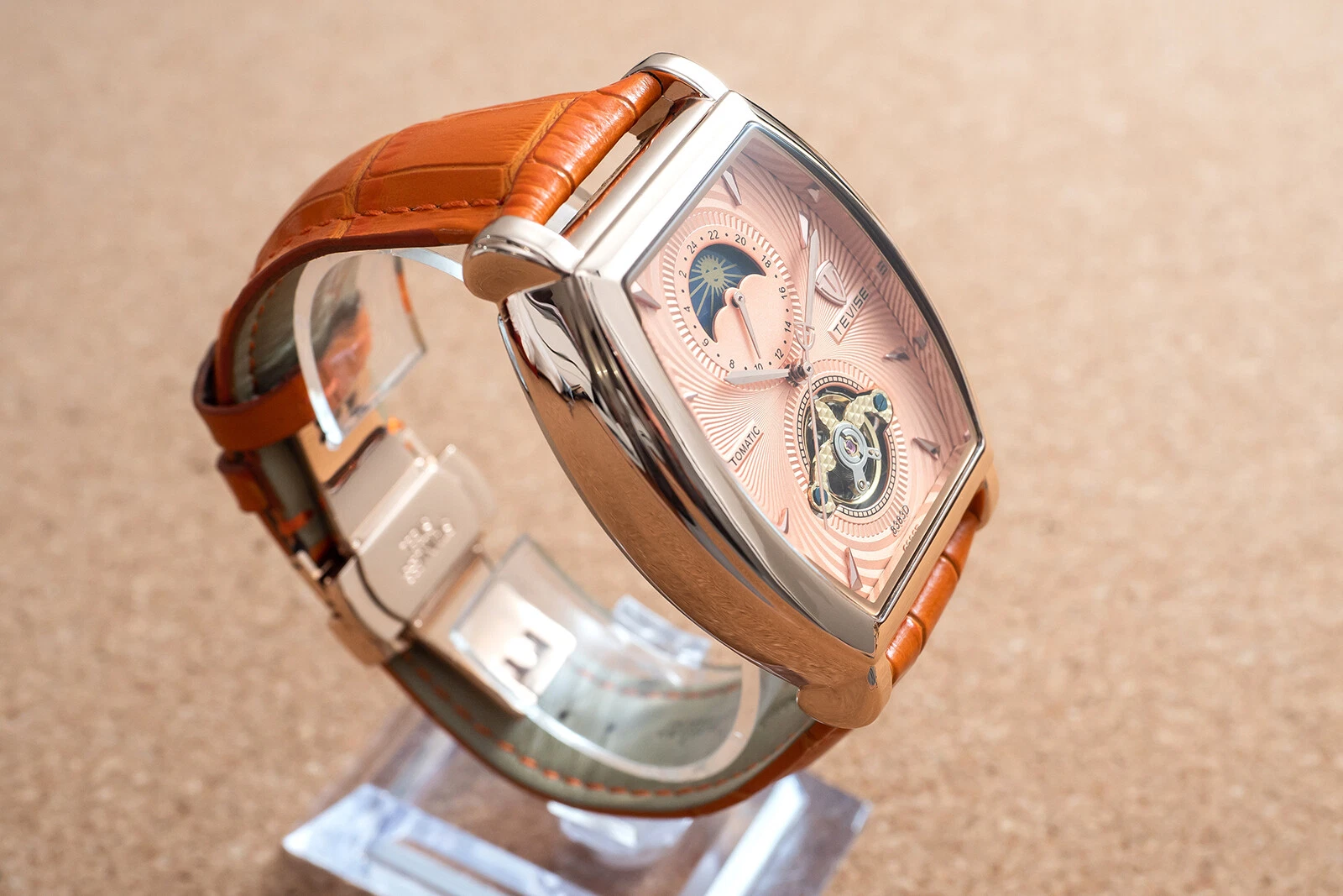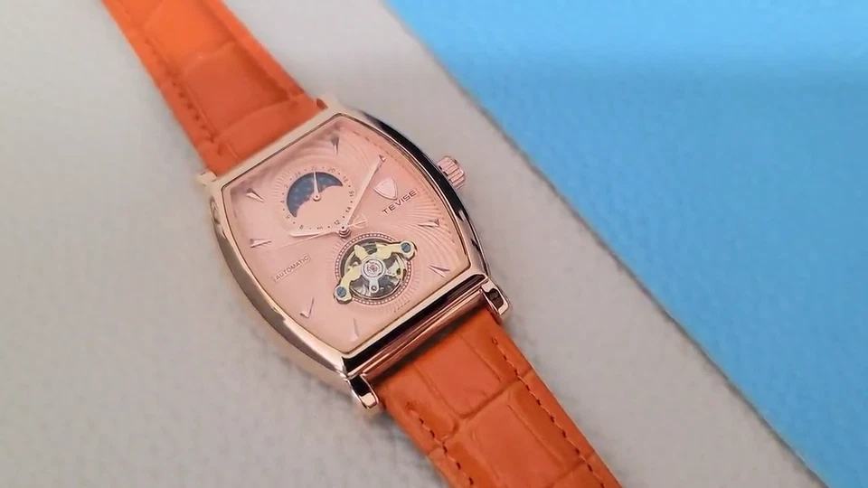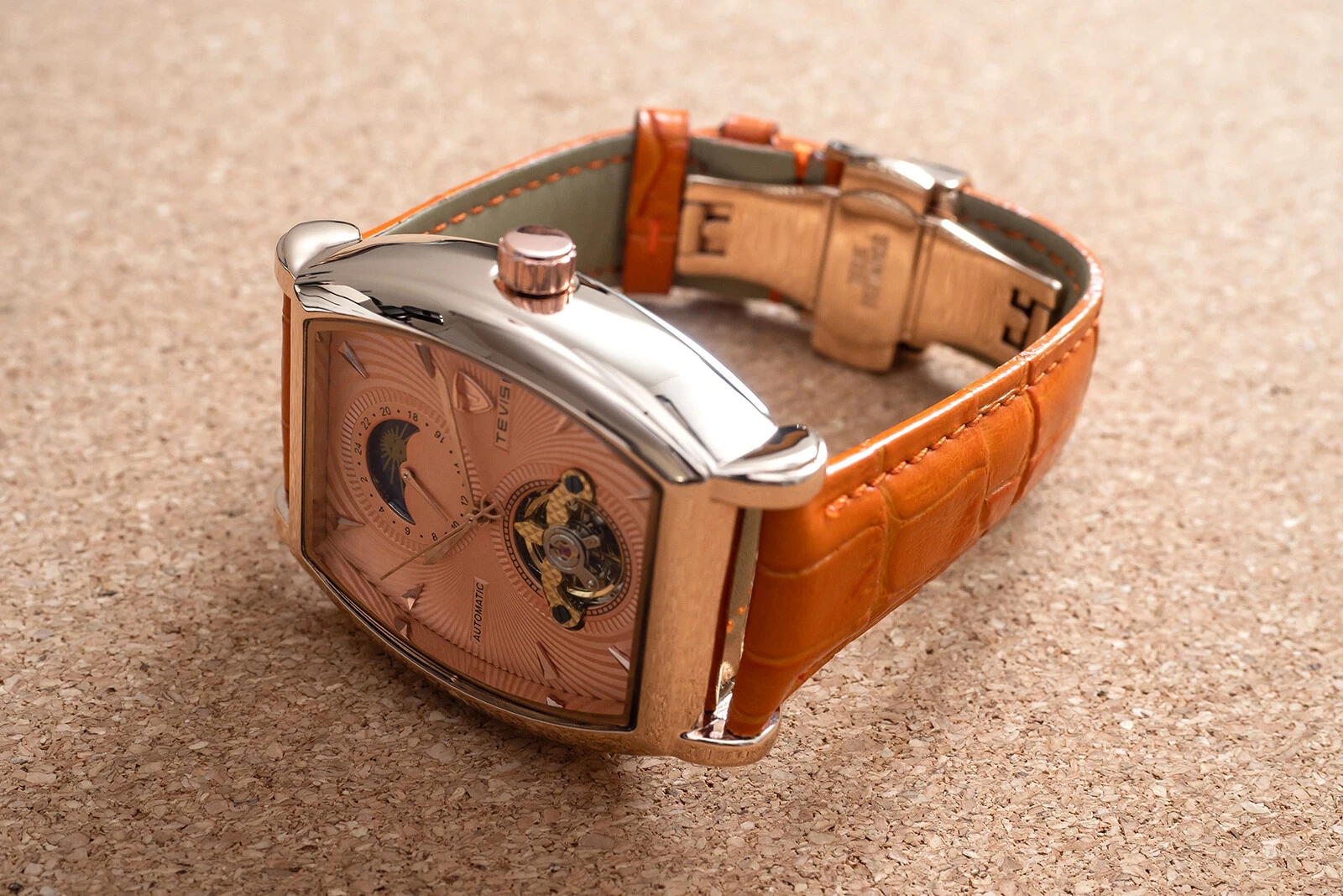 Mens Rose Gold Moon Phase Automatic Mechanical Watch Orange Leather 24HR Dial