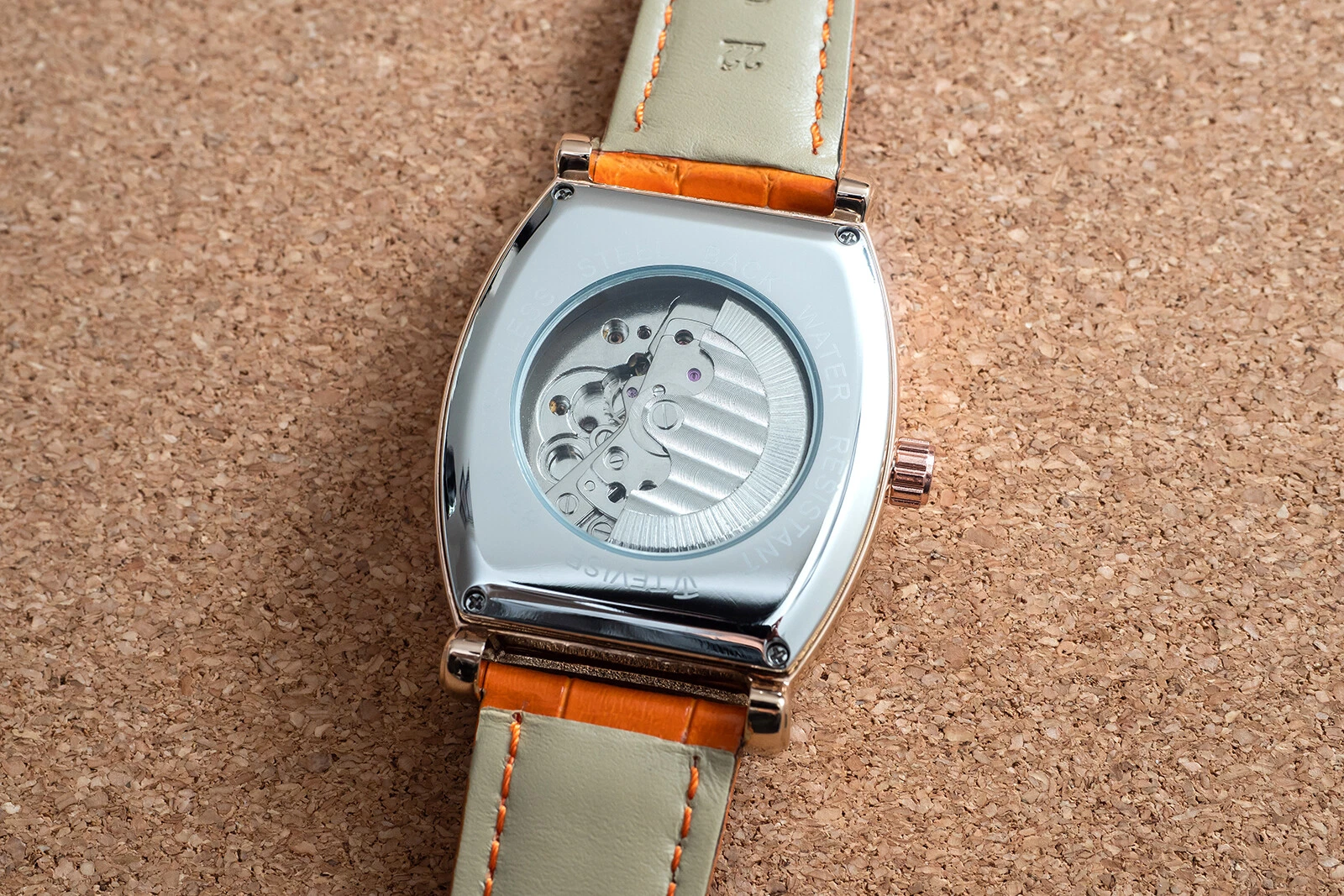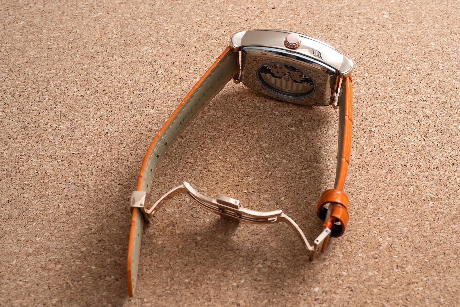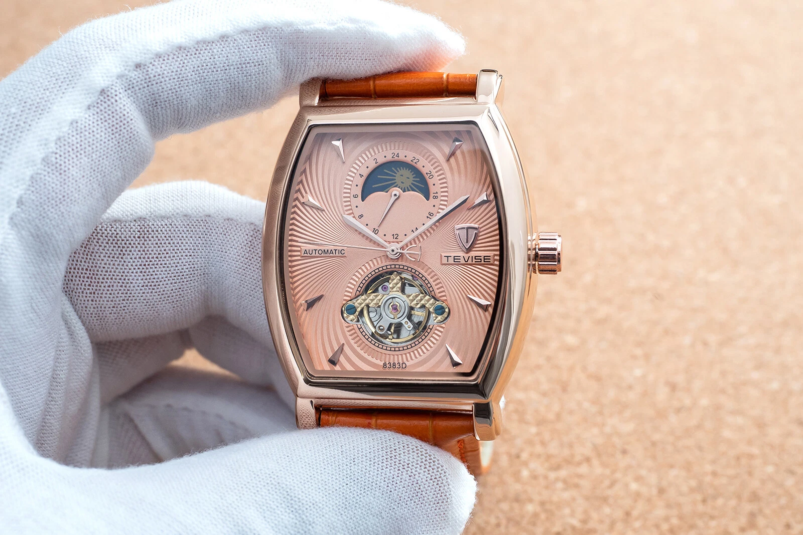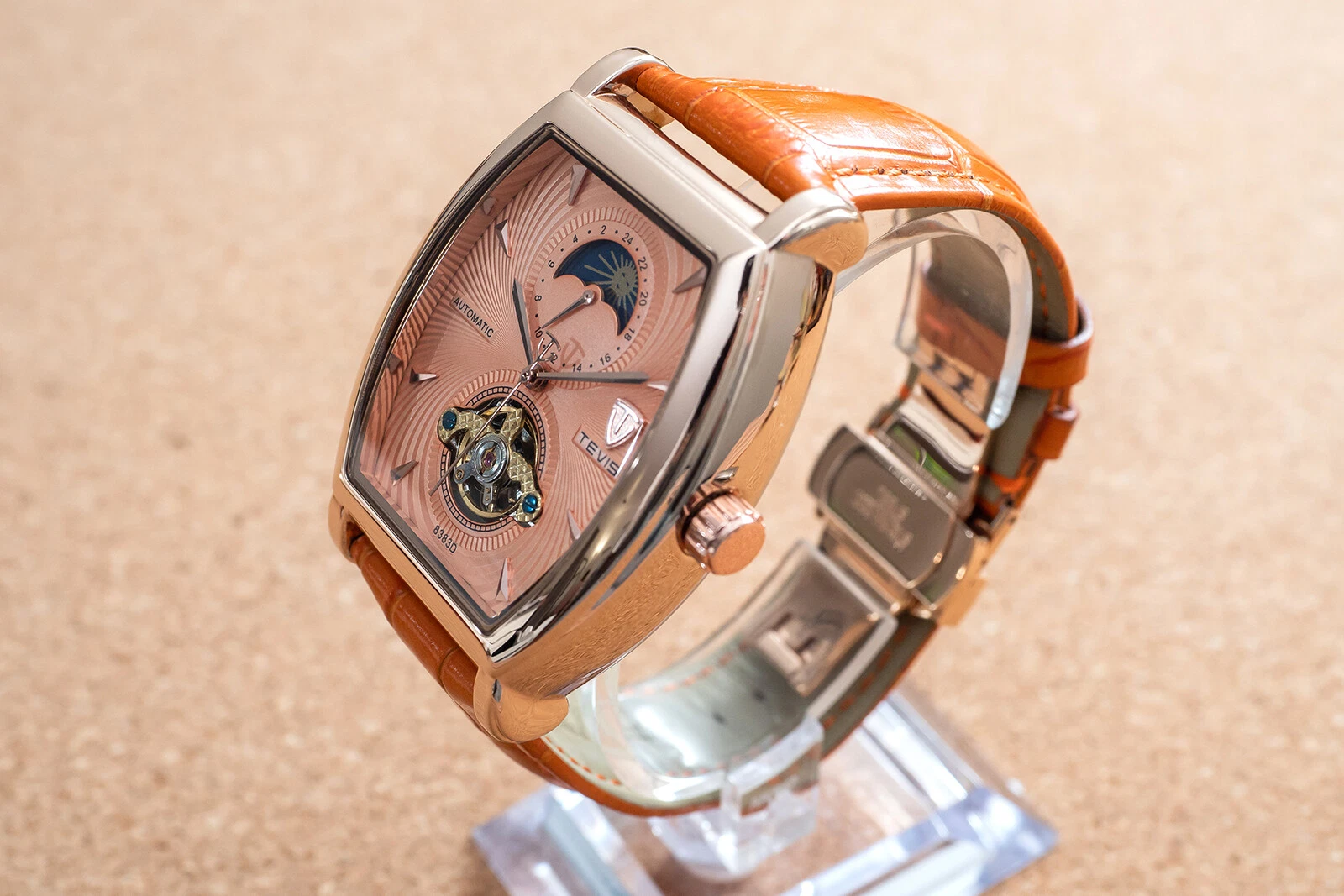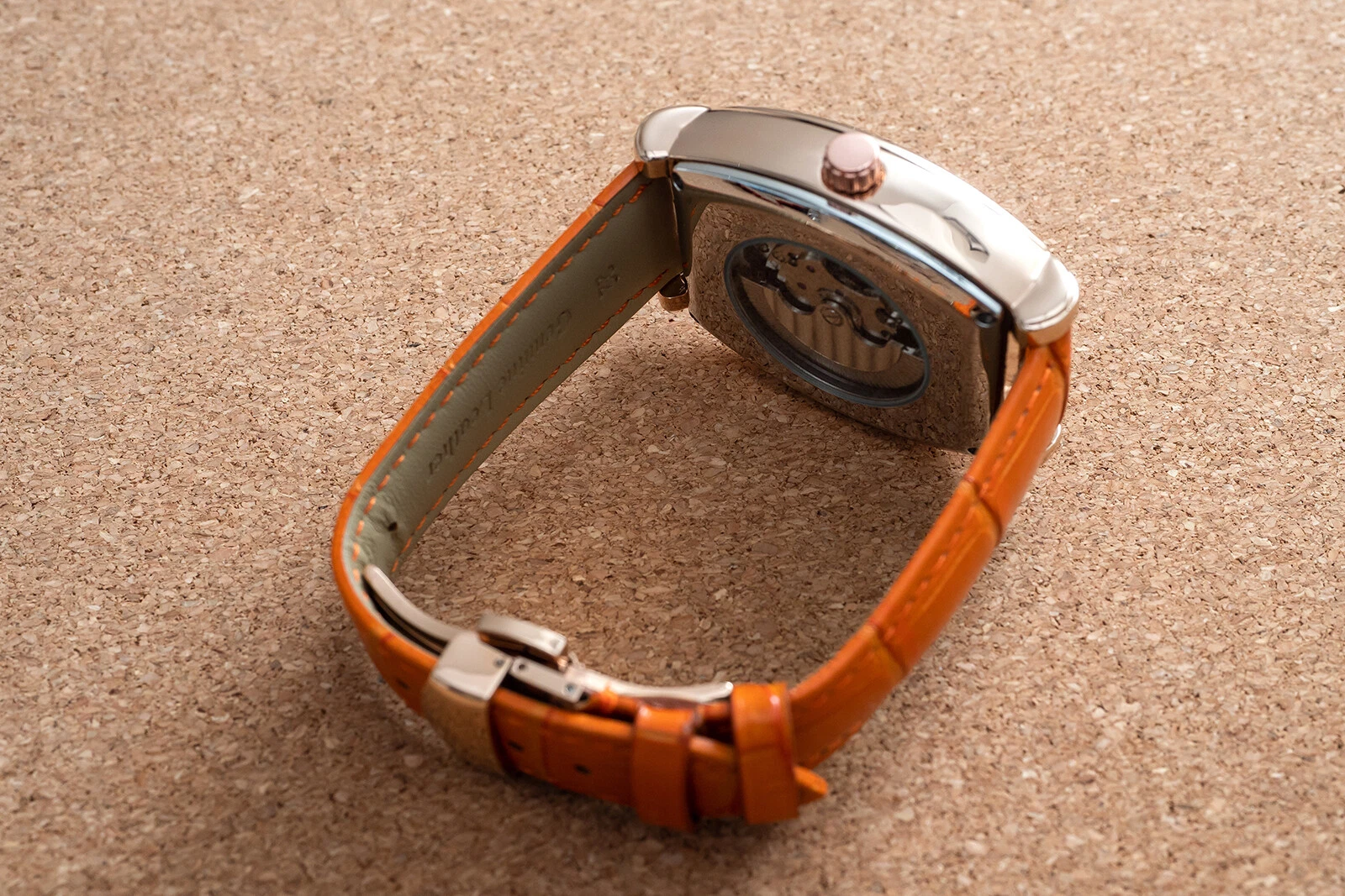 Mens Rose Gold Moon Phase Automatic Mechanical Watch Orange Leather 24HR Dial