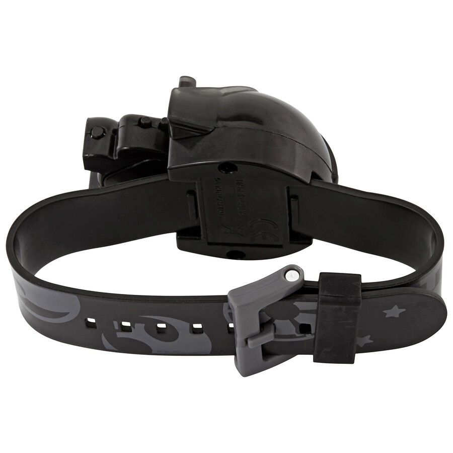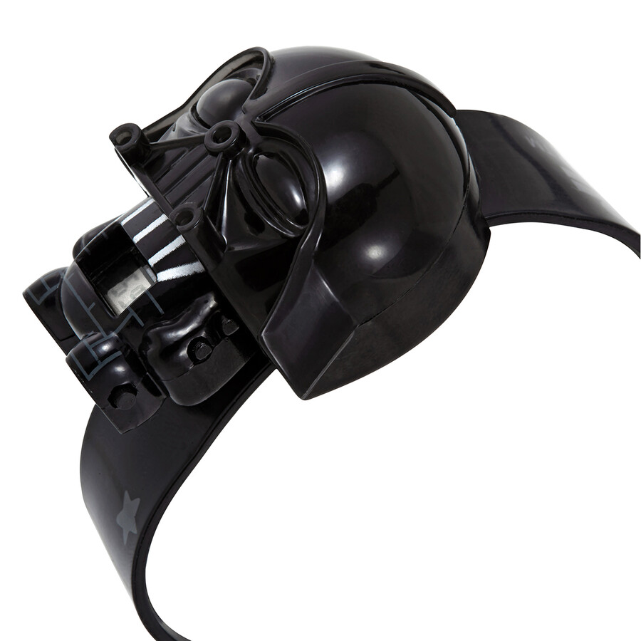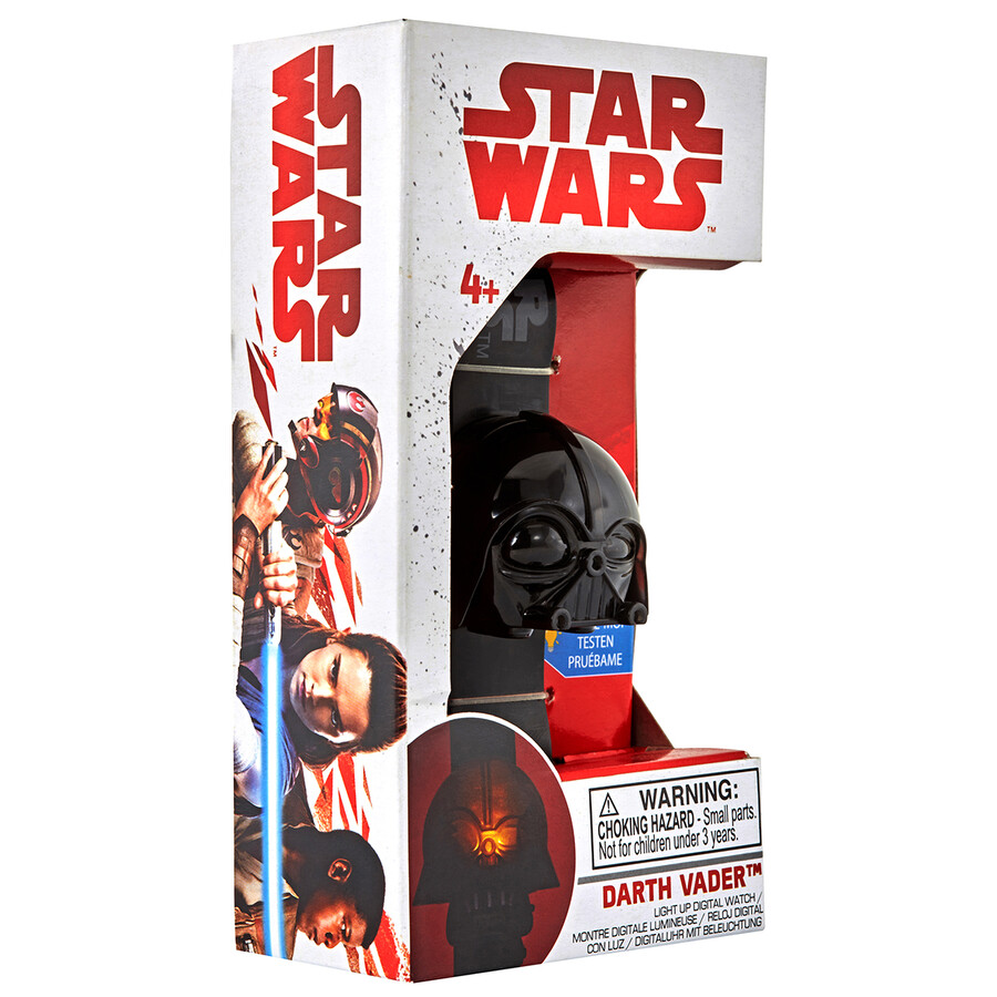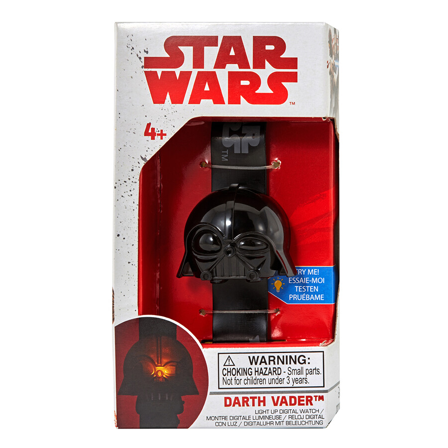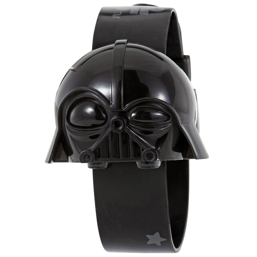 Black plastic case with a black silicone strap. Fixed black plastic Darth Vader minifigure with a digital dial. Dial Type: digital. Automatic movement. Scratch resistant plastic crystal. Unique case shape. Case size: 40 mm. Case thickness: 15 mm. Band width: 18 mm. Tang clasp. Water resistant at 200 meters / 660 feet. Functions: hour, minute, second. Bulbbotz Star Wars Series. Sport watch style. Lego BulbBotz Star Wars Darth Vader Kids Light-Up Digital Watch 2021098.