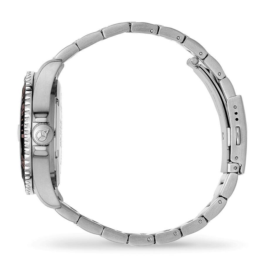 Stainless steel case with a stainless steel bracelet. Uni-directional rotating stainless steel bezel with an inlaid black ring. Black, brown dial with luminous rose gold-tone hands and dot hour markers. Arabic numerals appear at th 6, 9 and 12 o'clock positions. Minute markers around the outer rim. Dial Type: Analog. Luminescent hands and markers. Date display at the 3 o'clock position. Quartz movement. Scratch resistant mineral crystal. Pull / push crown. Solid case back. Round case shape. Case size: 40 mm. Case thickness: 13 mm. Band width: 20 mm. Deployment clasp. Water resistant at 100 meters / 330 feet. Functions: date, hour, minute, second. Ice Steel - Black Sunset Silver - Medium - 3h Series. Casual watch style. Ice-Watch Quartz Brown Dial Stainless Steel Unisex Watch 016768
