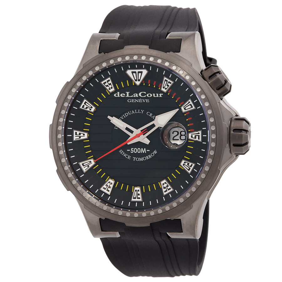 Black titanium case with a black rubber strap. Uni-directional rotating silver-tone titanium bezel. Black dial with silver-tone hands and Arabic numeral & index hour markers. Minute markers around the outer rim. Dial Type: Analog. Date display at the 3 o'clock position. Calibre DC 261 automatic movement. Scratch resistant sapphire crystal. Screw down crown. Solid case back. Round case shape, case size: 48 mm, case thickness: 13 mm. Band width: 26 mm, band length: 8 inches. Tang clasp. Water resistant at 500 meters / 1650 feet. Functions: date, hour, minute, second. Additional Info: hours, minutes, seconds, date. Promess Series. Dive watch style. DeLaCour Promess Automatic Black Dial Men's Watch WATI0040-1342.