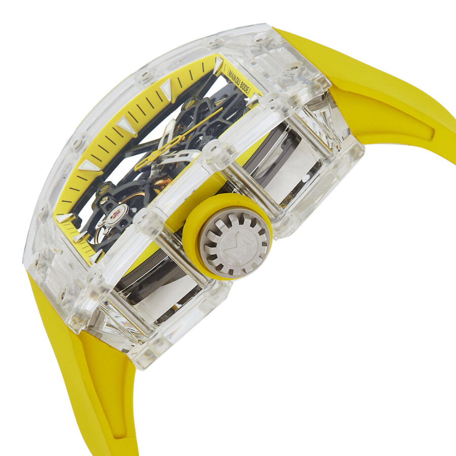 Transparent resin case with a yellow rubber strap. Fixed transparent resin bezel. Transparent dial with black hands and index hour markers. Minute markers around the outer rim. Dial Type: Analog. Luminescent hands and markers. Automatic movement with a 60-hour power reserve. Scratch resistant crystal glass crystal. Transparent see through case back. Tonneau case shape, case size: 50mm x 42mm x 18mm. Tang clasp. Water resistant at 50 meters / 165 feet. Functions: hour, minute, second. Sport watch style. Maikou Bode Automatic Men's Watch MB.002.2.
