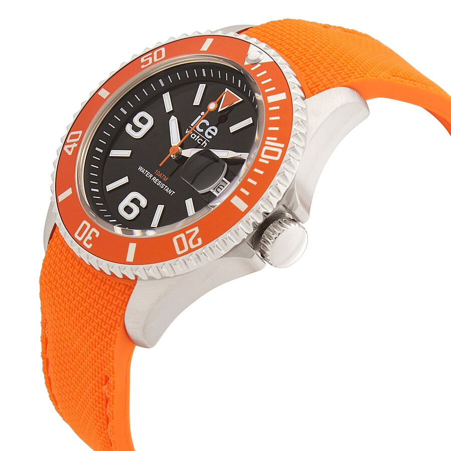 Stainless steel case with a orange rubber strap. Uni-directional rotating stainless steel bezel with an inalid orange ring. Black dial with luminous silver-tone hands and index hour markers. Arabic numerals at 6 and 9 o clock positions. Minute markers around the outer rim. Dial Type: Analog. Luminescent hands and markers. Date display at the 3 o'clock position. Quartz movement. Scratch resistant mineral crystal. Pull / push crown. Solid case back. Round case shape. Case size: 40 mm. Band width: 20 mm. Tang clasp. Water resistant at 100 meters / 330 feet. Functions: date, hour, minute, second. Casual watch style. Ice-Watch Quartz Black Dial Unisex Watch 020375.
