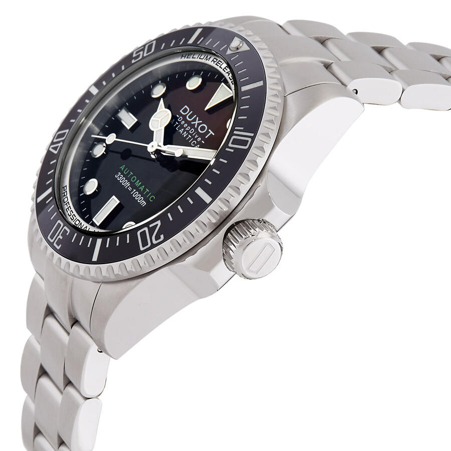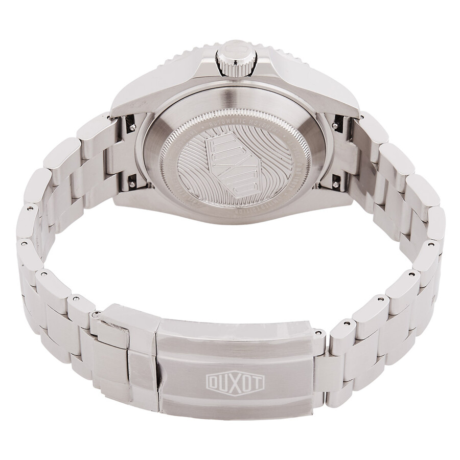 Discover the world beneath the waves with the Atlantica Deep Dive Automatic Limited Edition. Equipped with a staggering 100 ATM water resistance and a reliable NH35 automatic movement, this is a true diver watch that stands the rigours of the sea. Together with its gradient-coloured dial with enamel finishing, this is an exclusive timepiece that satisfies both desk divers and aquatic enthusiasts. Silver-tone stainless steel case and bracelet. Uni-directional rotating black stainless steel bezel. Red dial with silver-tone hands and index hour markers. Minute markers around the outer rim. Dial Type: Analog. Luminescent hands and markers. Date display at the 3 o'clock position. SII Caliber NH35A Automatic movement, containing 24 Jewels, bitting at 21600 vph, and has a power reserve of approximately 41 hours. Scratch resistant sapphire crystal. Screw down crown. Solid case back. Round case shape, case size: 44 mm, case thickness: 17 mm. Band width: 22 mm, band length: 8 inches. Fold over clasp with a safety release. Water resistant at 1000 meters / 3300 feet. Functions: date, hour, minute, second. Atlantica Deep Dive Series. Dive watch style. Watch label: Japan Movt. Duxot Atlantica Deep Dive Automatic Red Dial Men's Watch DX-2066-33.