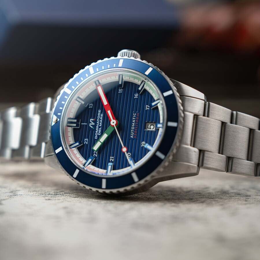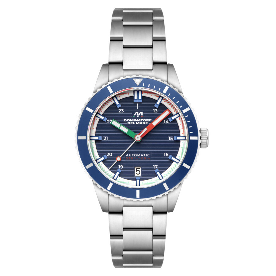 The Scilla Automatic is a diver watch that combines flair with a touch of playfulness. The vibrant colours on the hour and minute hands Silver-tone stainless steel case and bracelet. Uni-directional rotating blue stainless steel bezel. Blue dial with red hands and index hour markers. Minute markers around the outer rim. Dial Type: Analog. Luminescent hands and markers. Date display at the 6 o'clock position. Seiko - NH35 automatic movement. Scratch resistant mineral crystal. Pull / push crown. Solid case back. Round case shape, case size: 42 mm, case thickness: 14 mm. Band width: 20 mm, band length: 8 inches. Fold over clasp. Water resistant at 100 meters / 330 feet. Functions: date, hour, minute, second. Scilla Series. Casual watch style. Dominatore Del Mare Scilla Blue Dial Men's Watch DD-8027-22.