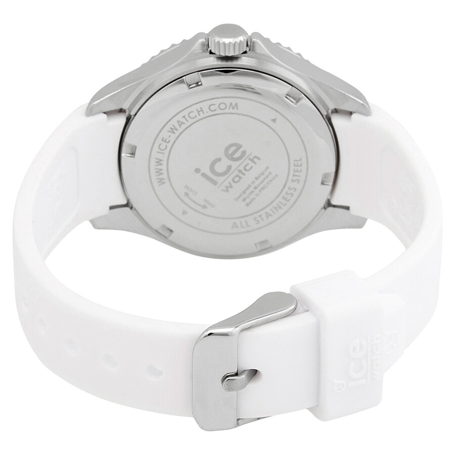 Stainless steel case with a white rubber strap. Uni-directional rotating stainless steel bezel with an inlaid white ring. Blue dial with luminous silver-tone hands and crystal hour markers. Index markers at the 6, 9 and 12 o'clock positions. Minute markers around the outer rim. Dial Type: Analog. Luminescent hands and markers. Date display at the 3 o'clock position. Quartz movement. Scratch resistant mineral crystal. Pull / push crown. Solid case back. Round case shape. Case size: 36 mm. Band width: 18 mm. Tang clasp. Water resistant at 100 meters / 330 feet. Functions: date, hour, minute, second. Casual watch style. Ice-Watch Quartz Crystal Blue Dial Unisex Watch 020365.