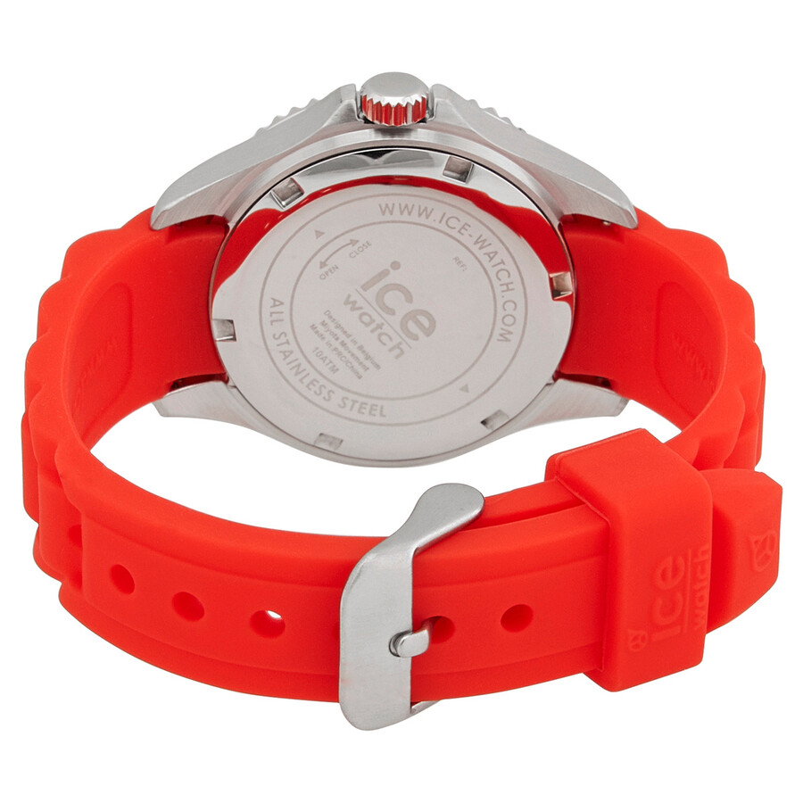 Silver-tone stainless steel case with a red rubber strap. Uni-directional rotating silver-tone stainless steel with an inlaid blue ring bezel. Red and blue dial with luminous blue hands and Arabic numeral hour markers. Minute markers around the outer rim. Dial Type: Analog. Luminescent hands. Date display at the 3 o'clock position. Quartz movement. Scratch resistant mineral crystal. Pull / push crown. Solid case back. Round case shape, case size: 36 mm. Band width: 18 mm. Tang clasp. Water resistant at 100 meters / 330 feet. Functions: date, hour, minute, second. Spider Series. Casual watch style. Ice-Watch Spider Quartz Unisex Watch 020364.