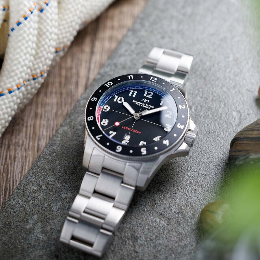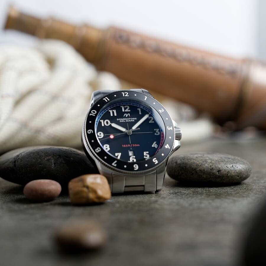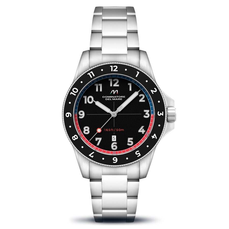 The Bandiera features a Japan Quartz movement with a date display, contained within a 42mm case diameter. Its unidirectional turning bezel adds a stylish touch, while its band provides comfortable and reliable wearing. Ideal for those who appreciate classic timepieces. Silver-tone stainless steel case and bracelet. Uni-directional rotating black stainless steel bezel. Black dial with silver-tone hands and Arabic numeral hour markers. Minute markers around the outer rim. Dial Type: Analog. Luminescent hands and markers. Date display at the 6 o'clock position. Seiko - VJ32 quartz movement. Pull / push crown. Solid case back. Round case shape, case size: 42 mm, case thickness: 12.5 mm. Band width: 20 mm, band length: 8 inches. Fold over clasp with a safety release. Water resistant at 50 meters / 165 feet. Functions: date, hour, minute, second. Bandiera Series. Casual watch style. Dominatore Del Mare Bandiera Quartz Black Dial Men's Watch DD-8020-55.