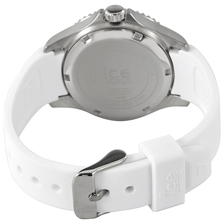 Stainless steel case with a white rubber strap. Uni-directional rotating silver-tone stainless steel with an inlaid white ring bezel. Pastel pink dial with luminous silver-tone hands and crystal hour markers. Index markers at the 6, 9 and 12 o'clock positions. Minute markers around the outer rim. Dial Type: Analog. Luminescent hands and markers. Date display at the 3 o'clock position. Quartz movement. Scratch resistant mineral crystal. Pull / push crown. Solid case back. Round case shape. Case size: 36 mm. Band width: 18 mm. Tang clasp. Water resistant at 100 meters / 330 feet. Functions: date, hour, minute, second. Casual watch style. Ice-Watch Quartz Crystal Unisex Watch 020366.