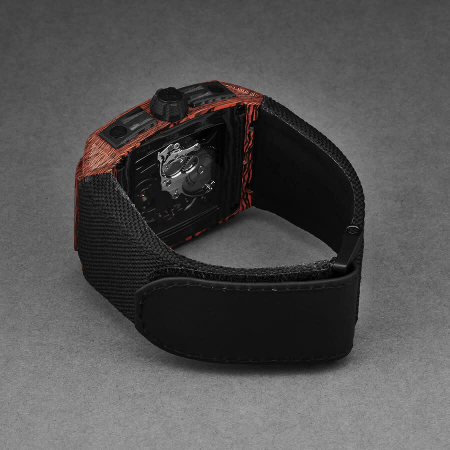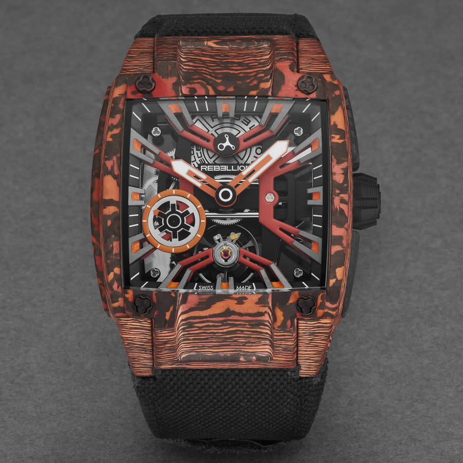 Black carbon fiber case with a black velcro band. Fixed black carbon fiber bezel. Black dial with red hands and index hour markers. Minute markers around the outer rim. Dial Type: Analog. Hand wind movement. Scratch resistant sapphire crystal. Pull / push crown. Solid case back. Rectangle case shape, case size: 38.5 mm, case thickness: 13.5 mm. Band width: 30 mm. Fold over clasp. Water resistant at 30 meters / 100 feet. Functions: hour, minute, second. Additional Info: hour, minute, seconds. Re-volt Series. Luxury watch style. Rebellion Re-Volt Hand Wind Black Dial Men's Watch RB.REV.3H.CA.MAV.
