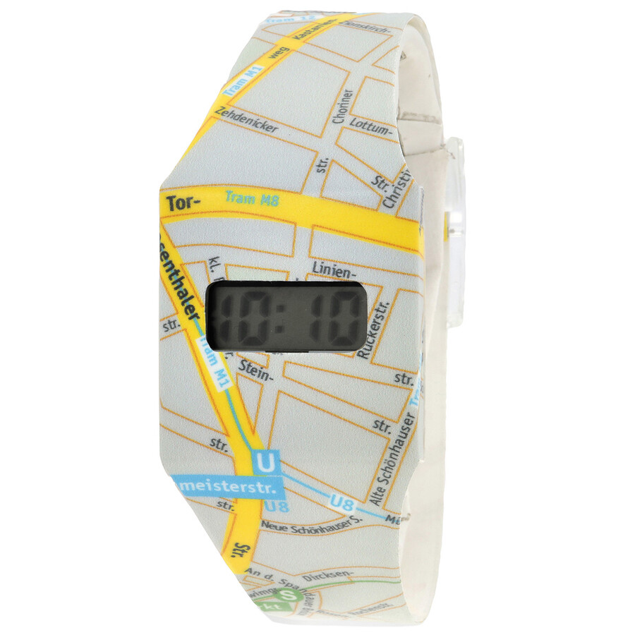 Multicolored tyvek case and band. Digital dial. Dial Type: digital. Quartz movement. Solid case back. Square case shape, case size: 25 mm. Buckle clasp. Functions: hour, minute, second. Lost In Berlin Series. Sport watch style. PappWatch Lost In Berlin Paperlike Quartz Digital Unisex Watch PU10920.