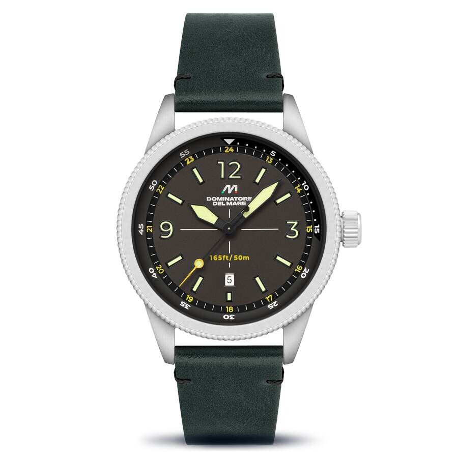 The Aviatore collection features a 42mm case diameter and a two-tone design on the dial. It boasts a versatile style and date display, making it an ideal choice for everyday wear. Showcase your sophisticated style without compromising on accuracy with this classic timepiece. Silver-tone stainless steel case with a green leather strap. Fixed silver-tone stainless steel bezel. Green dial with black hands and Arabic numeral & index hour markers. Minute markers around the outer rim. Dial Type: Analog. Luminescent hands and markers. Date display at the 6 o'clock position. Seiko - VJ32 quartz movement. Pull / push crown. Solid case back. Round case shape, case size: 42 mm, case thickness: 11 mm. Band width: 20 mm, band length: 8 inches. Water resistant at 50 meters / 165 feet. Functions: date, hour, minute, second. Aviatore Series. Casual watch style. Dominatore Del Mare Aviatore Quartz Green Dial Men's Watch DD-8021-07.