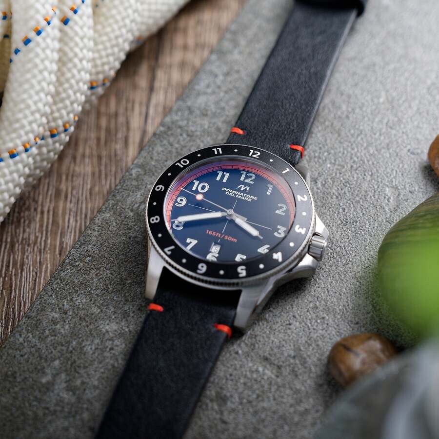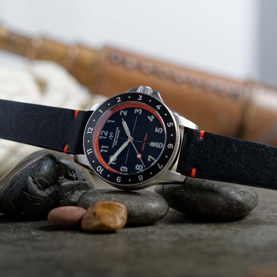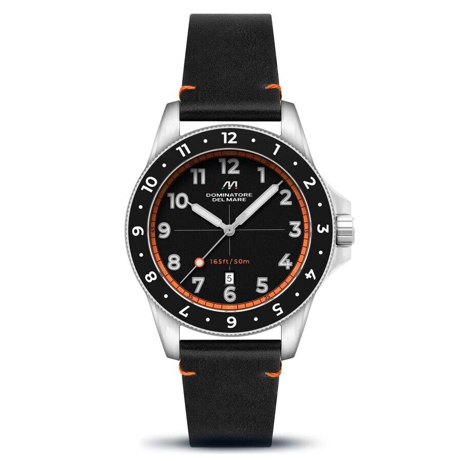 The Bandiera features a Japan Quartz movement with a date display, contained within a 42mm case diameter. Its unidirectional turning bezel adds a stylish touch, while its band provides comfortable and reliable wearing. Ideal for those who appreciate classic timepieces. Silver-tone stainless steel case with a black leather strap. Fixed silver-tone stainless steel bezel. Black dial with silver-tone hands and Arabic numeral hour markers. Minute markers around the outer rim. Dial Type: Analog. Luminescent hands and markers. Date display at the 6 o'clock position. Seiko - VJ32 quartz movement. Pull / push crown. Solid case back. Round case shape, case size: 42 mm, case thickness: 12.5 mm. Band width: 20 mm, band length: 8 inches. Water resistant at 50 meters / 165 feet. Functions: date, hour, minute, second. Bandiera Series. Casual watch style. Dominatore Del Mare Bandiera Black Dial Men's Watch DD-8020-05.