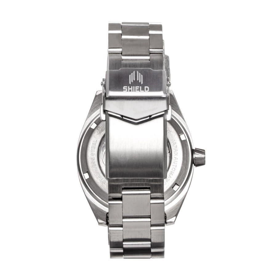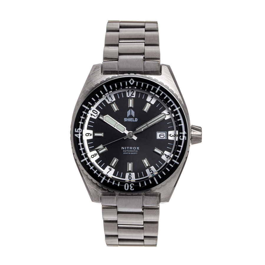 Stainless steel case with a stainless steel bracelet. Uni-directional rotating stainless steel with an inlaid black ring bezel. Black dial with luminous silver-tone hands and Arabic numeral / index hour markers. Minute markers around the outer rim. Dial Type: Analog. Luminescent hands and markers. Date display at the 3 o'clock position. Automatic movement. Scratch resistant mineral crystal. Screw down crown. Transparent case back. Round case shape. Case size: 42 mm. Case thickness: 15 mm. Band width: 20 mm. Band length: 8.5 inches. Deployment clasp with a push button release. Water resistant at 200 meters / 660 feet. Functions: date, hour, minute, second. Nitrox Series. Casual watch style. Watch label: Swiss Made. Shield Nitrox Automatic Black Dial Men's Watch SLDSH114-1.