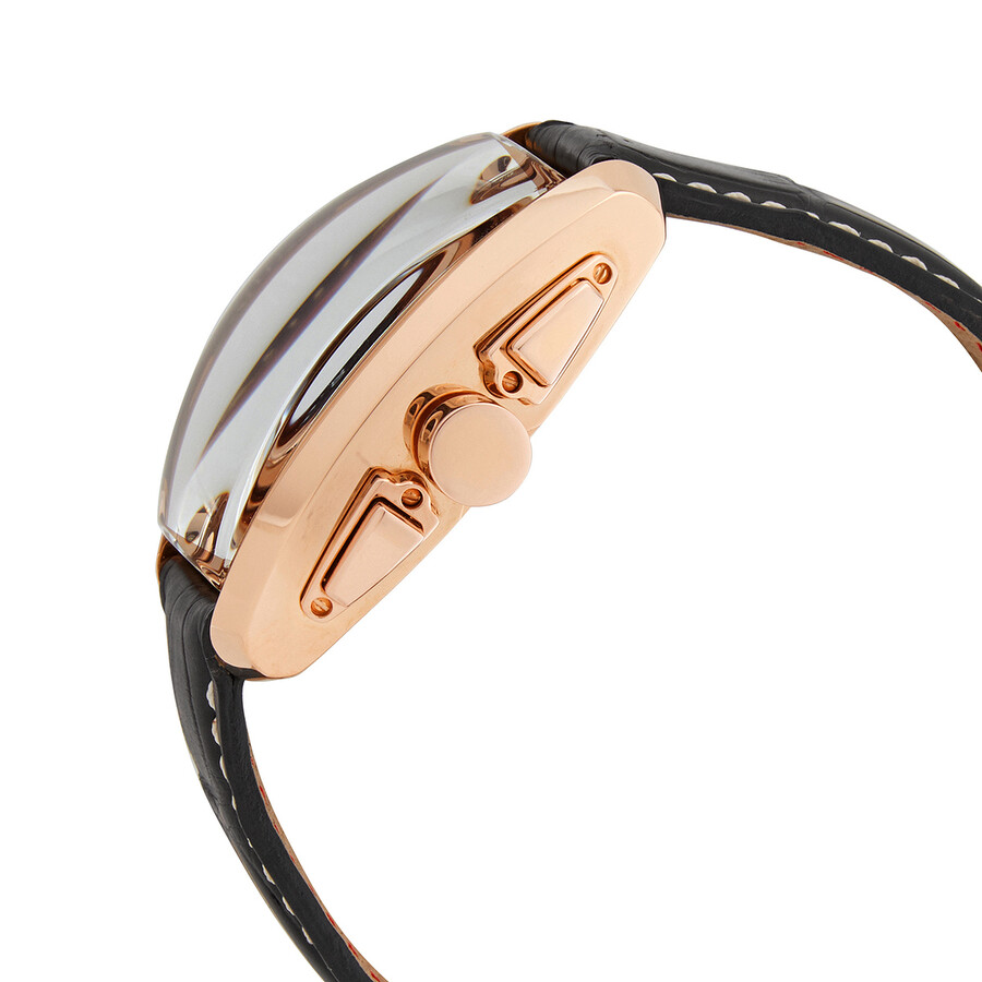 18kt rose gold case with a black (crocodile) leather strap. Fixed 18kt rose gold bezel. Black dial with rose gold-tone hands and index hour markers. Dial Type: Analog. Luminescent hands. Date display between the 4 and 5 o'clock positions. Chronograph - three sub-dials displaying: 60 second, 30 minute and 12 hour. Automatic movement. Scratch resistant sapphire crystal. Transparent case back. Tonneau case shape. Case dimensions: 38 mm x 50 mm, case thickness: 22 mm. Band width: 23 mm. Fold over18 mm clasp. Functions: chronograph, date, hour, minute, second. Panorama Series. Casual watch style. Locman Panorama Chronograph Automatic Black Dial Men's Watch R.154.
