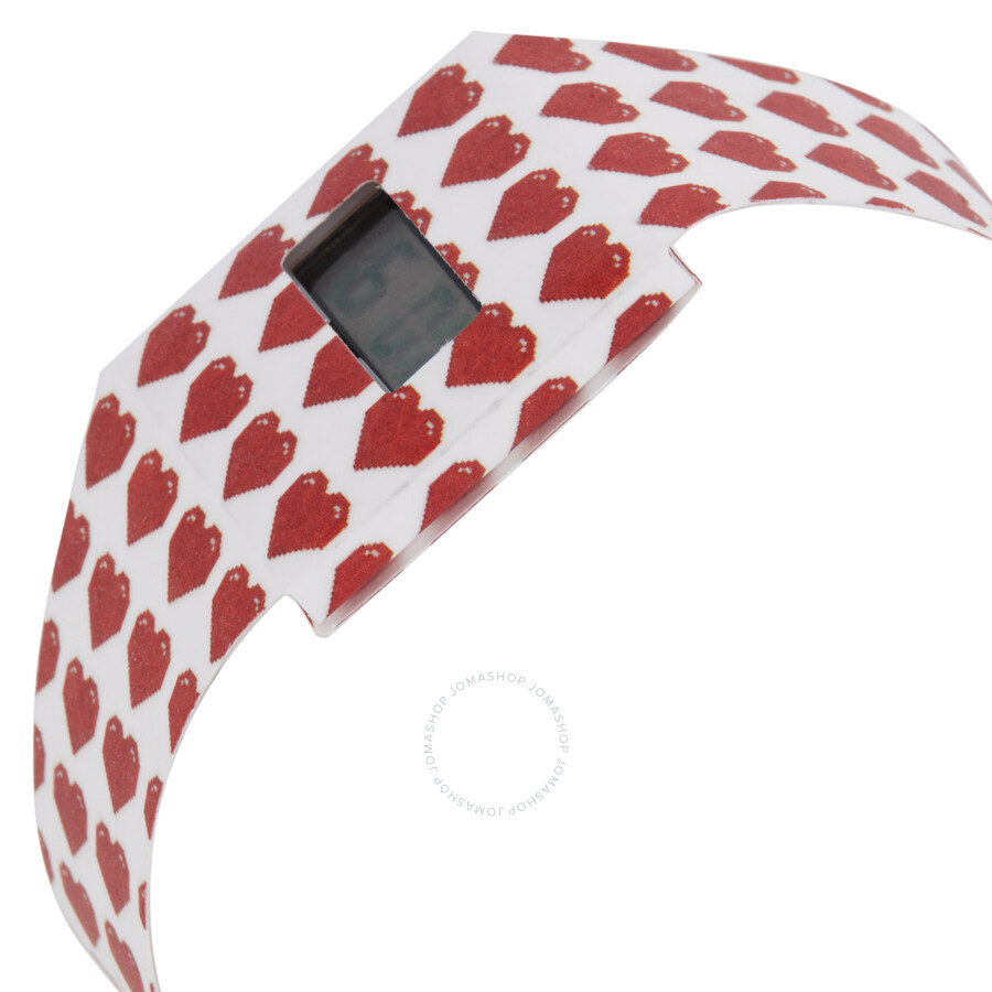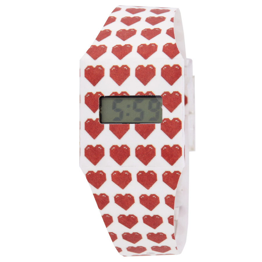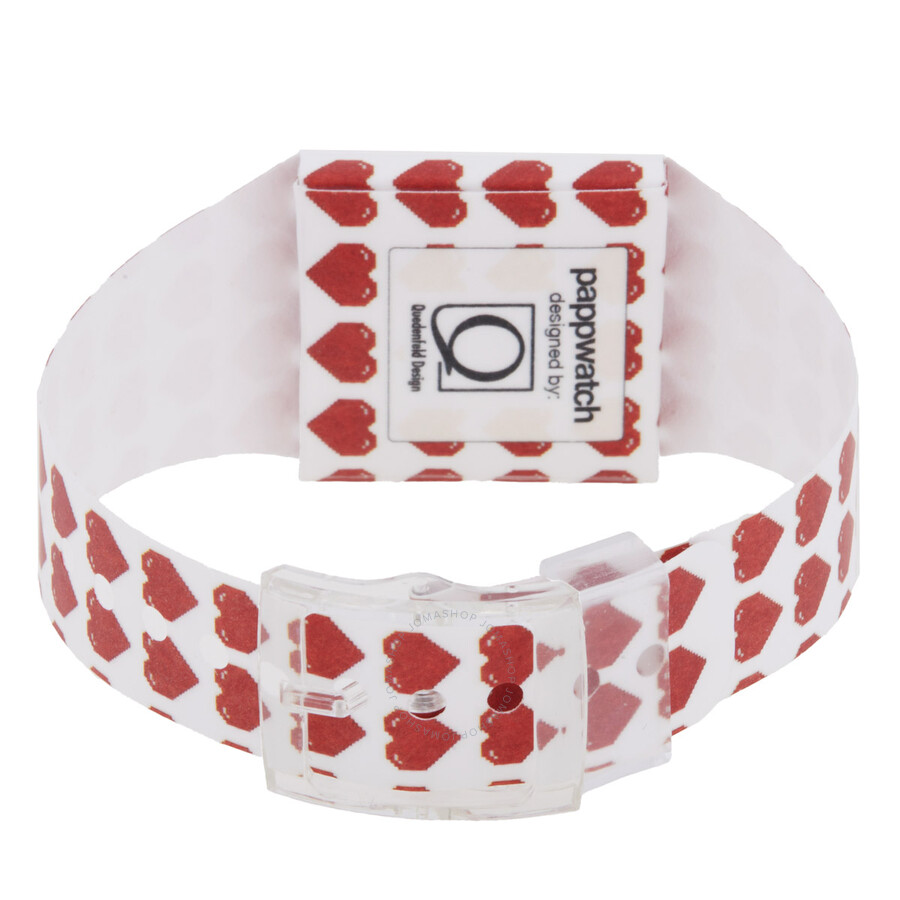 White printed hearts tyvek case and band. Digital dial. Dial Type: digital. Quartz movement. Solid case back. Square case shape, case size: 25 mm. Buckle clasp. Functions: hour, minute, second. Flirty Attack Series. Sport watch style. PappWatch Flirty Attack Paperlike Quartz Digital Unisex Watch PU10474.