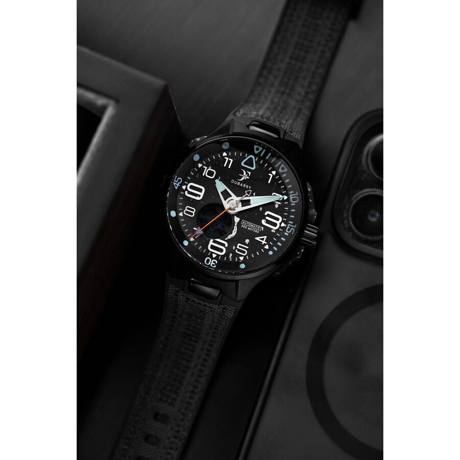 Black stainless steel case with a grey rubber strap. Bi-directional rotating black stainless steel bezel. Black dial with silver-tone hands and Arabic numeral hour markers. Minute markers around the outer rim. Dial Type: Analog. Luminescent hands and markers. Automatic Open-Heart, Myota Movement automatic movement. Scratch resistant sapphire crystal. Solid case back. Round case shape, case size: 42 mm, case thickness: 13 mm. Band width: 25 mm, band length: 8 inches. Tang clasp. Water resistant at 300 meters / 1000 feet. Functions: hour, minute, second. Additional Info: components made from recycled plastics found in the oceans. Deep Ocean Series. Luxury watch style. Franck Dubarry Deep Ocean Automatic Black Dial Men's Watch 06 BLACK.