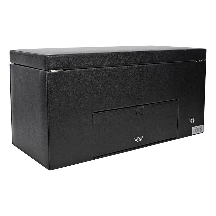 This Wolf triple watch winder is made of polished ebony Macassar wood, chrome-plated fittings, and black pleather. Lock-in cuff accomodates bracelets longer than 10". A backlit LCD display provides a countdown of rotations in the cycle. A fully customizable rotation program allows for between 300-1200 turns per day, clockwise, counterclockwise, and bi-directional turning, and different increments for delay, for up to 57 different programming combinations. Runs on an included 3.3V adapter or D batteries. Measures 18" L X 8" W X 9" H. Unique design allows for multiple winders to connect and run off a single power source. Plus, winder includes space to store three watches.