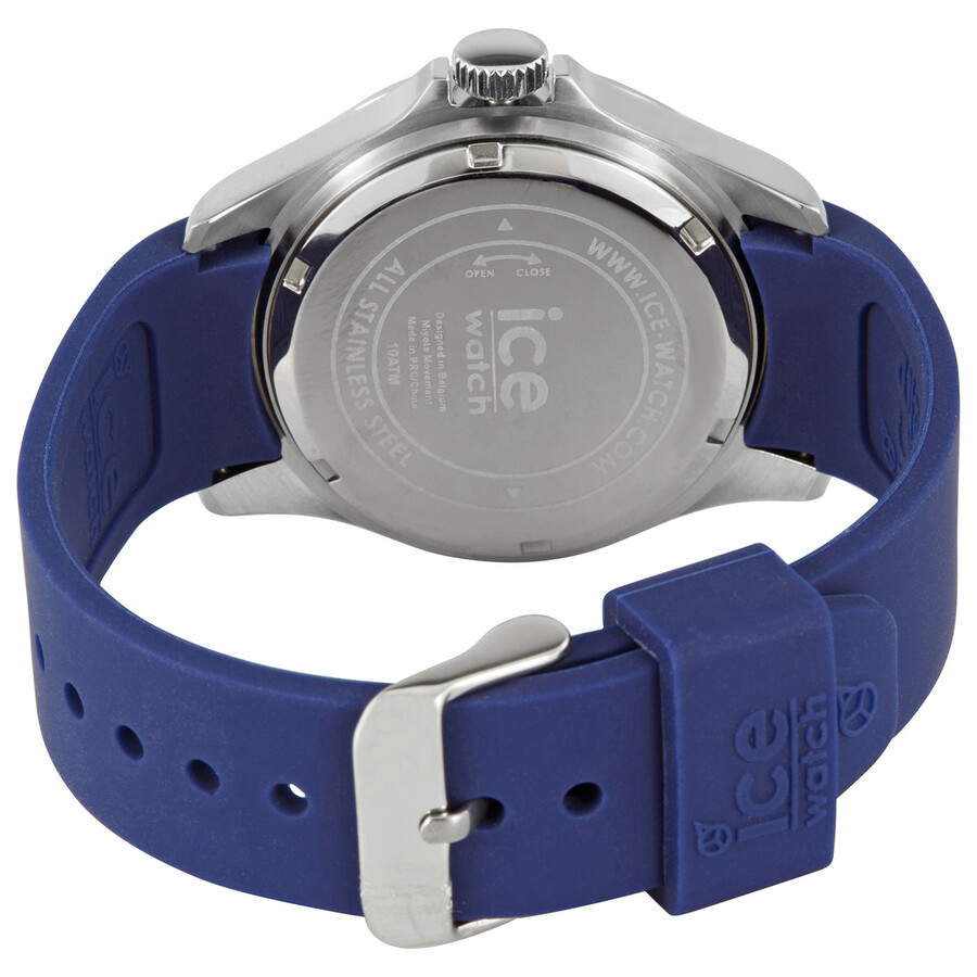 Stainless steel case with a blue rubber strap. Fixed stainless steel bezel. Sunset blue dial with luminous rose gold-tone hands and dot hour markers. Index markers appear at 3, 6 and 9 o clock positions. Minute markers around the outer rim. Dial Type: Analog. Luminescent hands and markers. Date display at the 3 o'clock position. Quartz movement. Scratch resistant mineral crystal. Pull / push crown. Solid case back. Round case shape. Case size: 40 mm. Band width: 20 mm. Tang clasp. Water resistant at 100 meters / 330 feet. Functions: date, hour, minute, second. Casual watch style. Ice-Watch Quartz Sunset Blue Dial Men's Watch 020387.