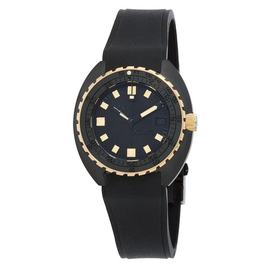 Black ceramic case with a black rubber strap. Uni-directional rotating black 18k 3n gold with ceramic inlay bezel. Black dial with luminous black hands and index hour markers. Minute markers around the outer rim. Dial Type: Analog. Luminescent hands and markers. Date display at the 3 o'clock position. ETA Caliber 2824-2 Automatic movement, based upon ETA 2824, containing 25 Jewels, bitting at 28800 vph, and has a power reserve of approximately 38 hours. Scratch resistant sapphire crystal. Screw down crown. Solid case back. Round case shape, case size: 42.50 x 44.5mm. Band width: 20 mm. Folding clasp. Water resistant at 300 meters / 1000 feet. Functions: date, hour, minute, second. Sub 300ß Sharkhunter Series. Sport watch style. Watch label: Swiss Made. Doxa SUB 300ß Sharkhunter Automatic Black Dial Men's Watch 830.20.101.20.