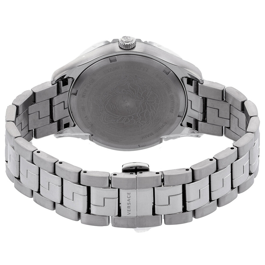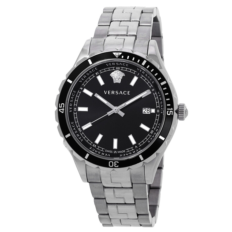 Silver-tone stainless steel case and bracelet. Black dial with silver-tone hands and index hour markers. Minute markers around the outer rim. Dial Type: Analog. Luminescent hands and markers. Date display at the 3 o'clock position. Quartz movement. Scratch resistant sapphire crystal. Round case shape, case size: 42 mm. Deployment with push button release clasp. Water resistant at 50 meters / 165 feet. Functions: hour, minute, second. Dress watch style. Versus by Versace Hellenyium Quartz Black Dial Men's Watch VE3A00520.
