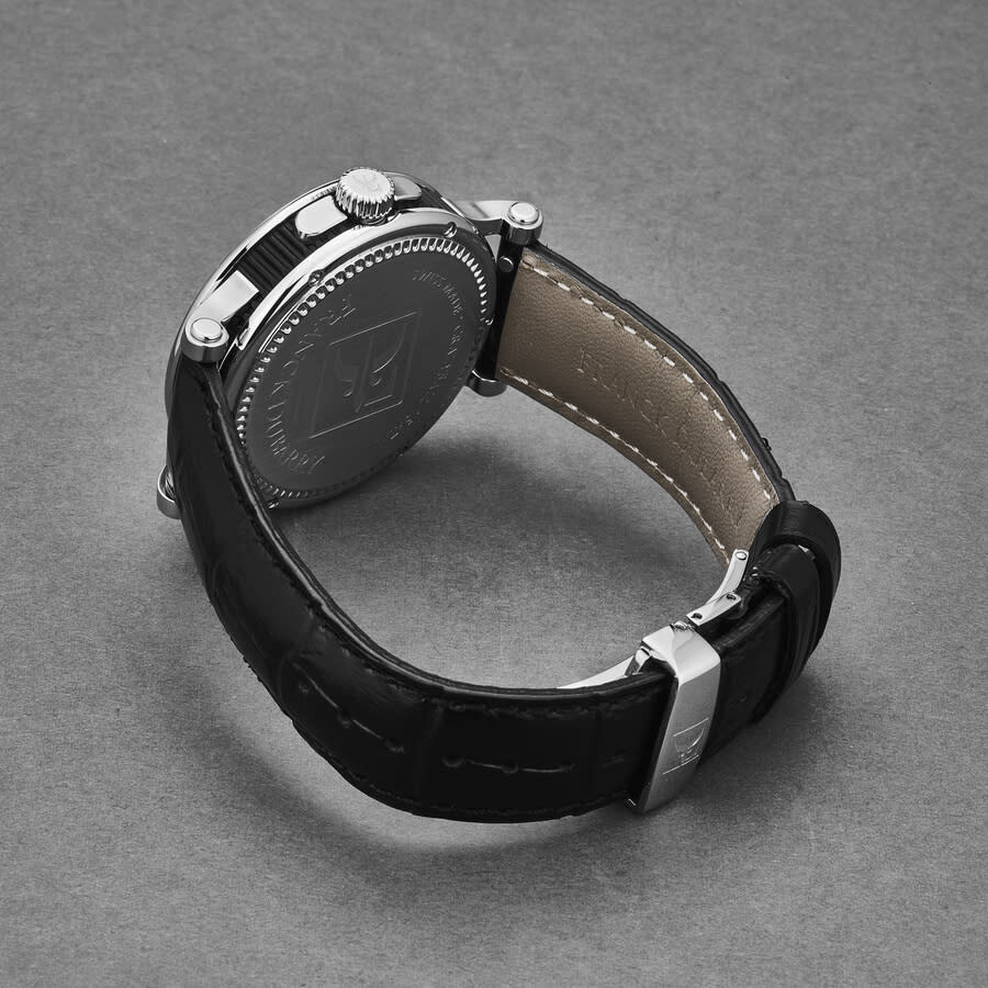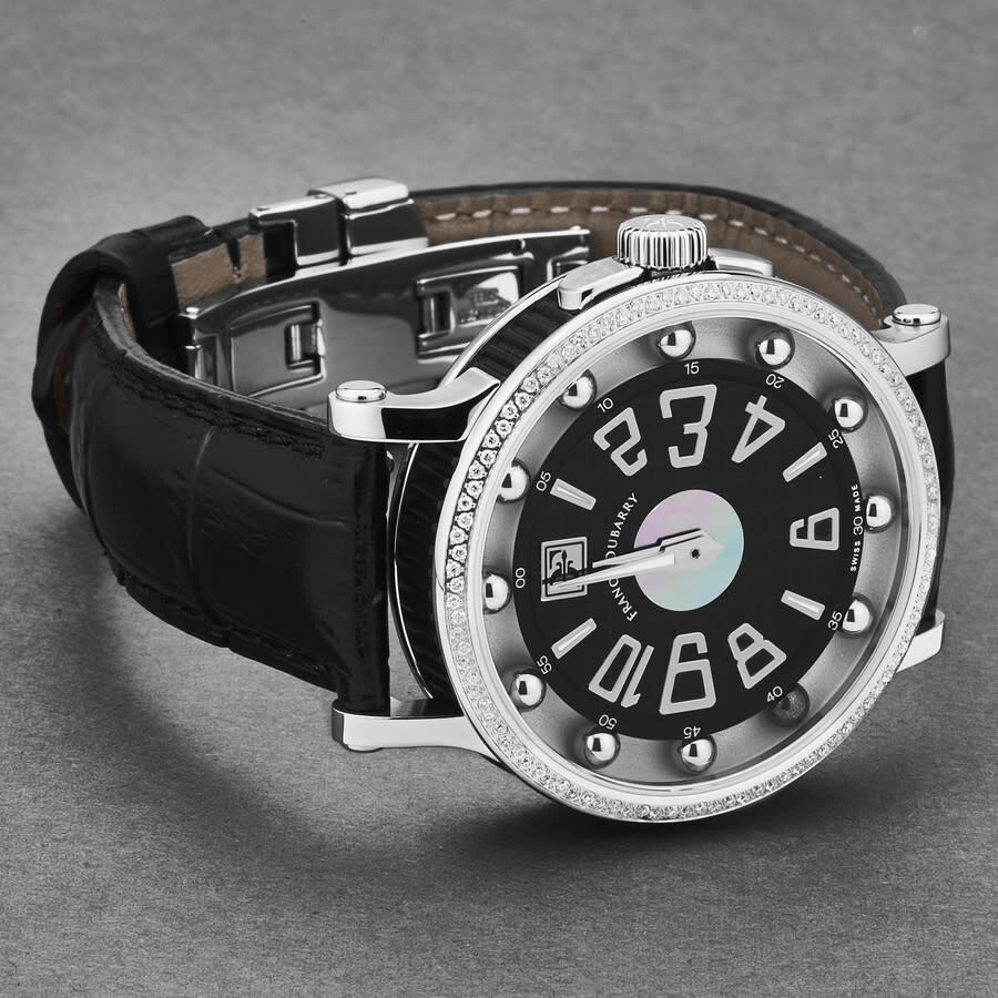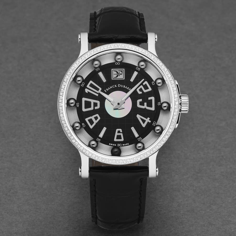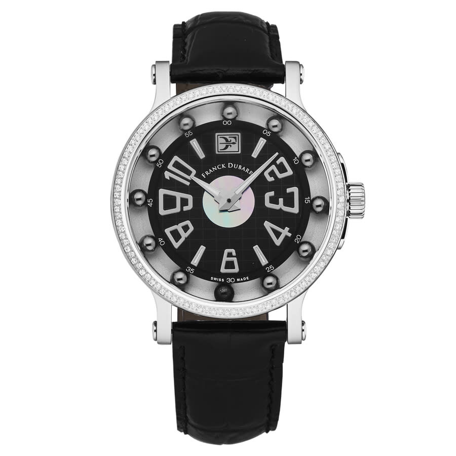 Stainless steel case with a black leather strap. Fixed stainless steel bezel. Black dial with silver-tone hands and Arabic numeral hour markers. Arabic numeral minute markers (at 5 minute intervals). Dial Type: Analog. Quartz movement. Scratch resistant sapphire crystal. Pull / push crown. Solid case back. Round case shape. Case size: 42 mm. Case thickness: 12 mm. Band width: 20 mm. Band length: 8 inches. Tang clasp. Water resistant at 50 meters / 165 feet. Functions: hour, minute, second. Crazy Balls Series. Luxury watch style. Watch label: Swiss Made. Franck Dubarry Crazy Balls Black Dial Ladies Watch CB0307.