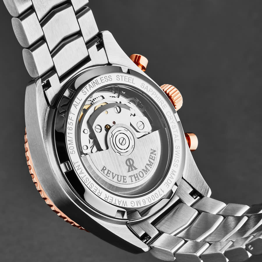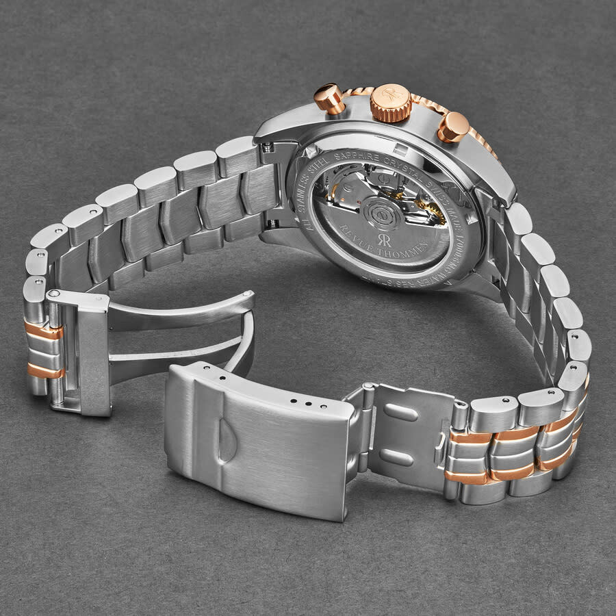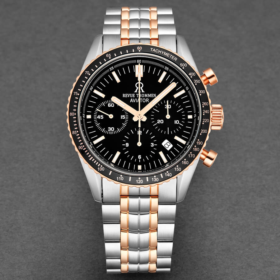 Silver-tone stainless steel case with a two-tone (silver-tone and rose gold-tone) stainless steel bracelet. Uni-directional rotating rose gold-tone stainless steel with an inlaid black ring showing tachymeter markings bezel. Black dial with luminous rose gold-tone hands and index hour markers. Arabic numeral minute markers (at 5 minute intervals). Minute markers around the outer rim. Dial Type: Analog. Luminescent hands and markers. Date display between 4 and 5 o'clock position. Chronograph - three sub-dials displaying: 60 second, 30 minute and 12 hour. Sellita Calibre SW510A Automatic movement, based upon Sellita SW500-1, containing 27 Jewels, bitting at 28800 vph, and has a power reserve of approximately 48 hours. Scratch resistant sapphire crystal. Pull / push crown. Transparent case back. Round case shape, case size: 42 mm, case thickness: 15 mm. Band width: 22 mm, band length: 8 inches. Fold over clasp. Water resistant at 50 meters / 165 feet. Functions: chronograph, tachymeter, date, hour, minute, second. Aviator Series. Sport watch style. Watch label: Swiss Made. Revue Thommen Aviator Chronograph Automatic Black Dial Men's Watch 17000.6157.
