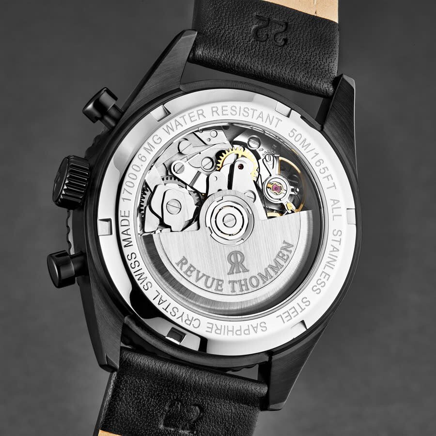 Black-plated stainless steel case with a black leather strap. Uni-directional rotating black-plated bezel with an inlaid black ring showing tachymeter markings. Black dial with luminous silver-tone hands and index hour markers. Arabic numeral minute markers (at 5 minute intervals). Minute markers around the outer rim. Dial Type: Analog. Luminescent hands and markers. Date display between the 4 and 5 o'clock positions. Chronograph - three sub-dials displaying: 60 second, 30 minute and 12 hour. Sellita calibre SW510A Automatic movement, based upon Sellita SW500-1, containing 27 Jewels, bitting at 28800 vph, and has a power reserve of approximately 48 hours. Scratch resistant sapphire crystal. Pull / push crown. Transparent case back. Round case shape. Case size: 42 mm. Case thickness: 15 mm. Band width: 22 mm. Band length: 8 inches. Tang clasp. Water resistant at 50 meters / 165 feet. Functions: chronograph, tachymeter, date, hour, minute, second. Aviator Series. Sport watch style. Watch label: Swiss Made. Revue Thommen Aviator Chronograph Automatic Black Dial Men's Watch 17000.6577.
