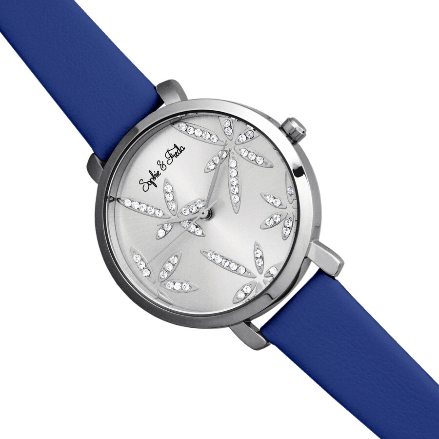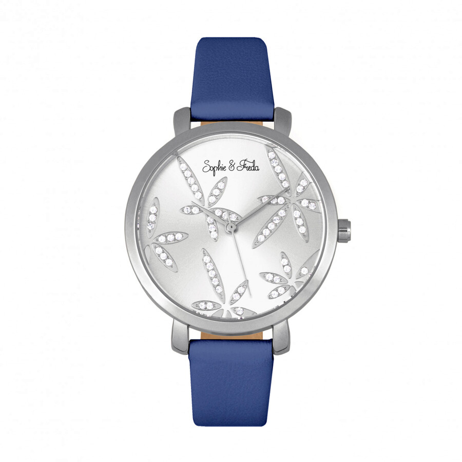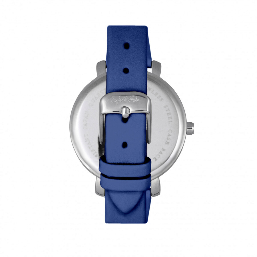 Silver-tone alloy case with a blue leather strap. Fixed silver-tone alloy bezel. Silver (crystal-set) dial with silver-tone hands. Dial Type: Analog. Quartz movement. Scratch resistant mineral crystal. Pull / push crown. Solid case back. Round case shape. Case size: 35 mm. Case thickness: 9 mm. Band width: 9 mm. Tang clasp. Water resistant at 30 meters / 100 feet. Functions: hour, minute, second. Key West Series. Dress watch style. Watch label: Japan Movt. Item Variations: SAFSF4301. Sophie And Freda Key West Silver Dial Ladies Watch SF4301.