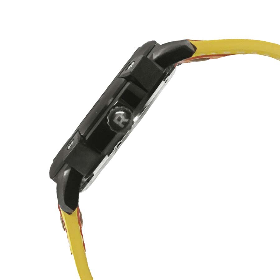 Black stainless steel case with a yellow leather strap. Fixed black stainless steel bezel. Bronze dial with black hands and index hour markers. Minute markers around the outer rim. Dial Type: Analog. One - 60 seconds subdial. Quartz movement. Scratch resistant mineral crystal. Push/pull crown. Solid case back. Round case shape, case size: 46 mm, case thickness: 11 mm. Band width: 22 mm, band length: 8.5 inches. Tang clasp. Water resistant at 100 meters / 330 feet. Functions: hour, minute, second. Casual watch style. Rebel Weeksville Men's Watch RB121-6201.