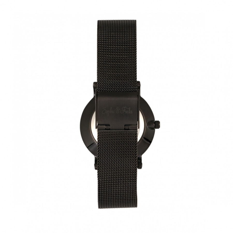 Black alloy case with a black alloy bracelet. Fixed black alloy bezel. Black dial with silver-tone hands and crystal hour markers. Dial Type: Analog. Quartz movement. Scratch resistant mineral crystal. Pull / push crown. Solid case back. Round case shape, case size: 32 mm, case thickness: 8 mm. Band width: 16 mm. Box with tongue and safety clasp. Water resistant at 30 meters / 100 feet. Functions: hour, minute, second. Dress watch style. Watch label: Japan Movt. Item Variations: SAFSF4203. Sophie And Freda Savannah Crystal Black Dial Ladies Watch SF4203.