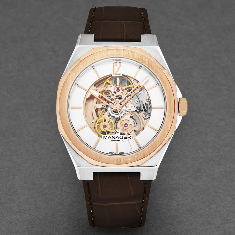 Silver-tone stainless steel case with a brown leather strap. Fixed rose gold-tone stainless steel bezel. Silver-tone dial with rose gold-tone hands and index hour markers. Dial Type: Analog. Luminescent hands and markers. Automatic movement. Scratch resistant sapphire crystal. Pull / push crown. Transparent case back. Round case shape, case size: 43 mm, case thickness: 11 mm. Band width: 23.5 mm, band length: 8 inches. Deployment with push button release clasp. Water resistant at 50 meters / 165 feet. Functions: hour, minute, second. Additional Info: hour, minute, second & date. Open Mind Series. Luxury watch style. Watch label: Swiss Made. Manager Open mind Automatic Silver Dial Men's Watch MAN-RO-05-BL.