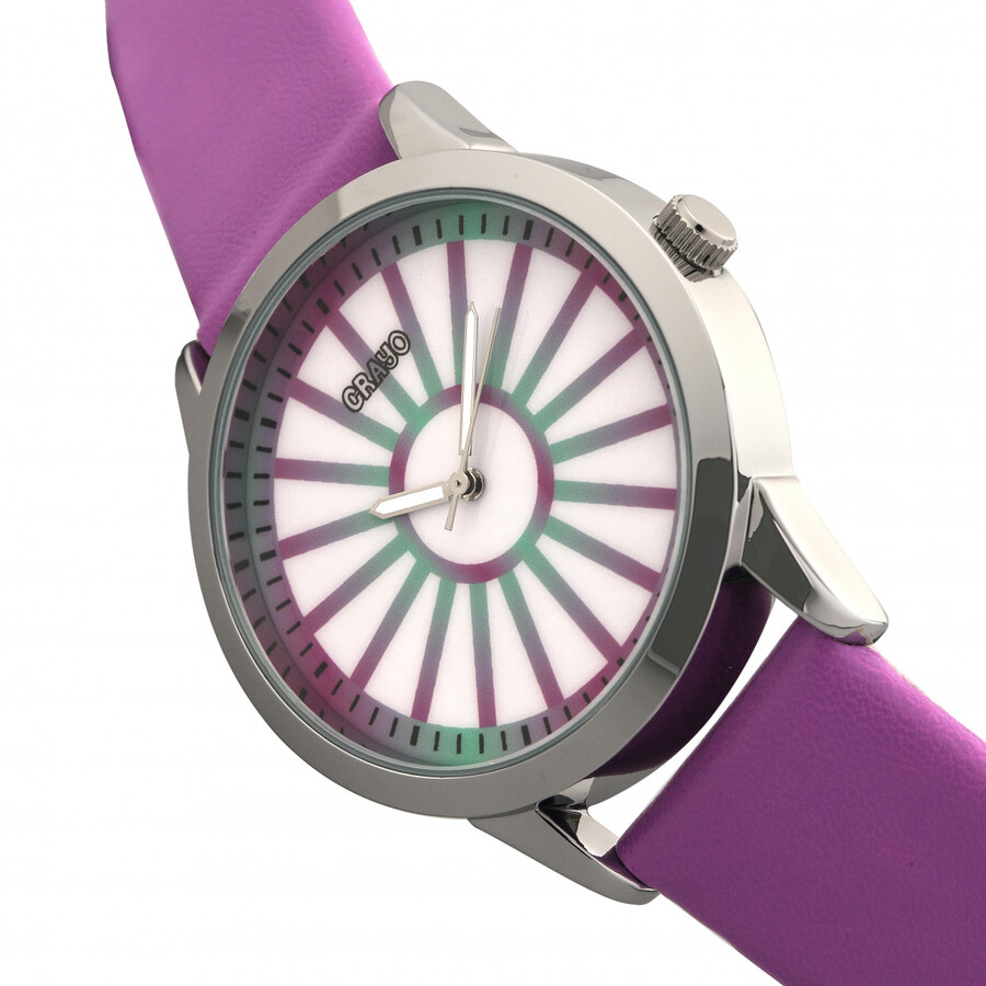 Silver-tone alloy case with a fuchsia leather strap. Fixed silver-tone alloy bezel. Multicolor dial with silver-tone hands and index hour markers. Minute markers around the outer rim. Dial Type: Analog. Luminescent hands. Quartz movement. Scratch resistant mineral crystal. Pull / push crown. Solid case back. Round case shape, case size: 41 mm, case thickness: 10 mm. Band width: 20 mm. Buckle clasp. Water resistant at 30 meters / 100 feet. Functions: hour, minute, second. Casual watch style. Watch label: Japan Movt. Crayo Electric Ladies Watch CRACR5001.