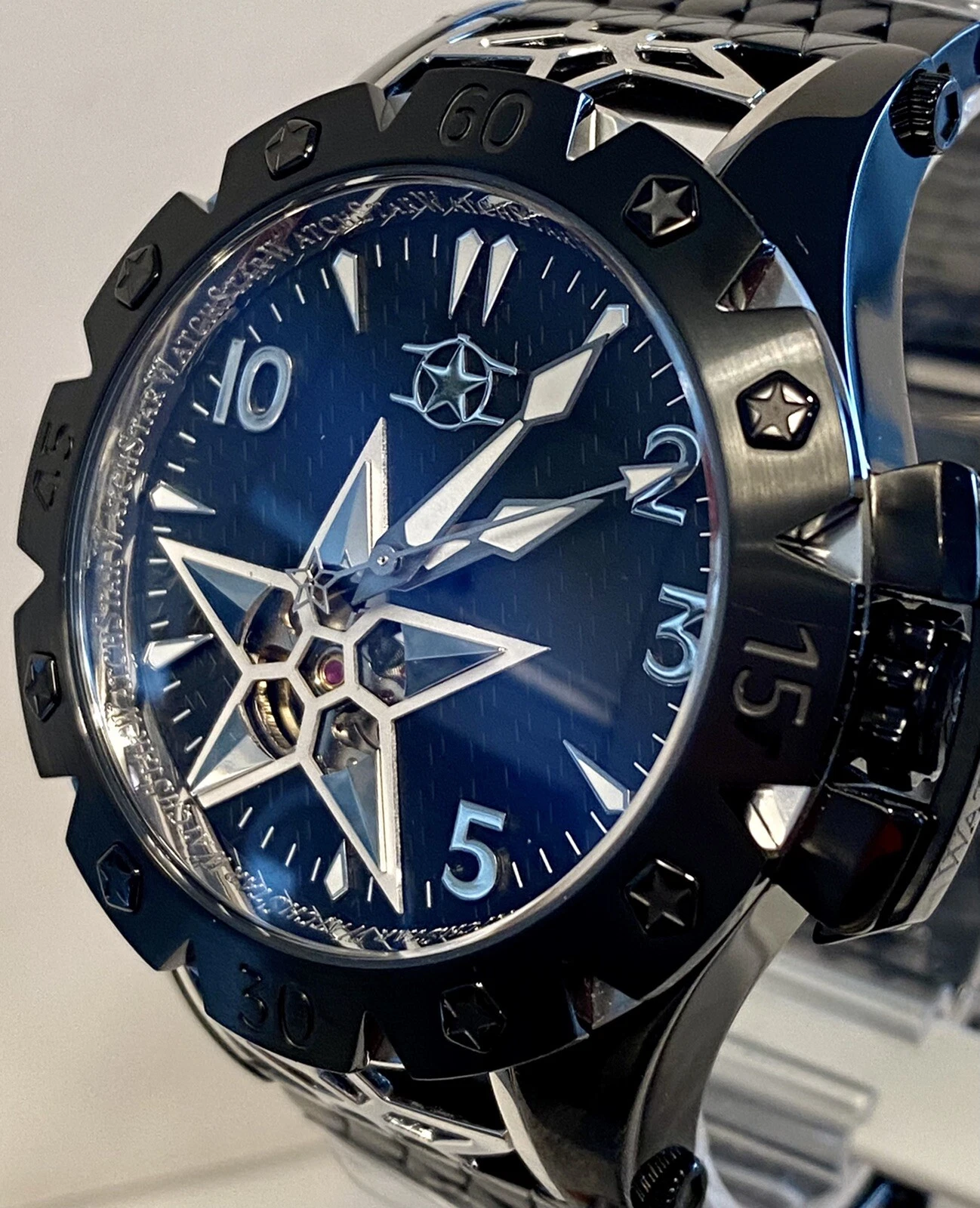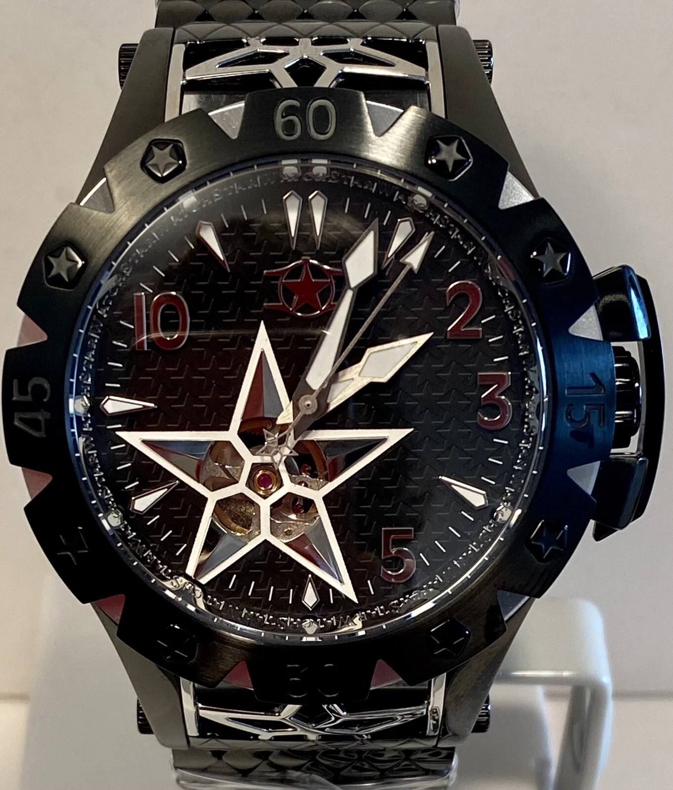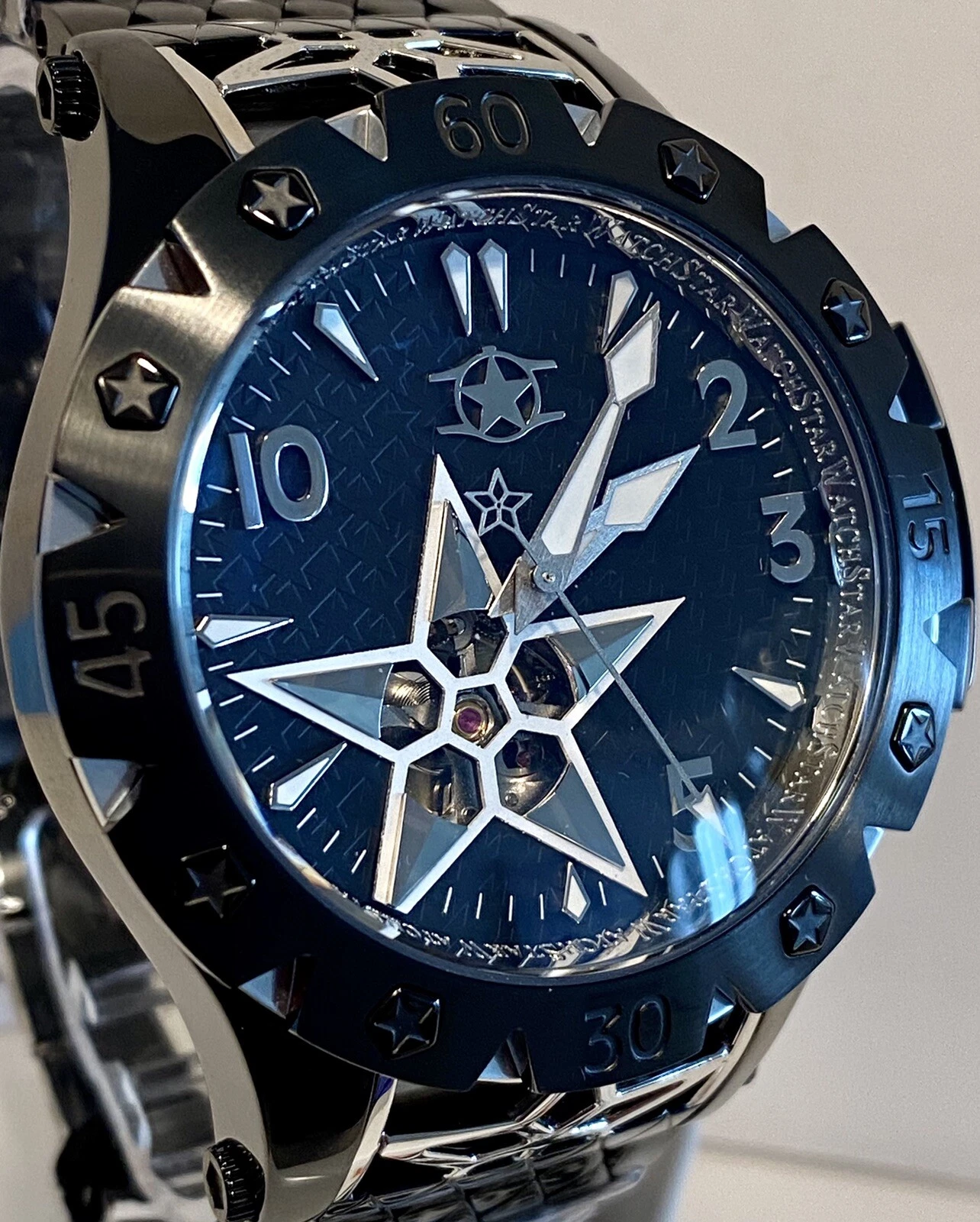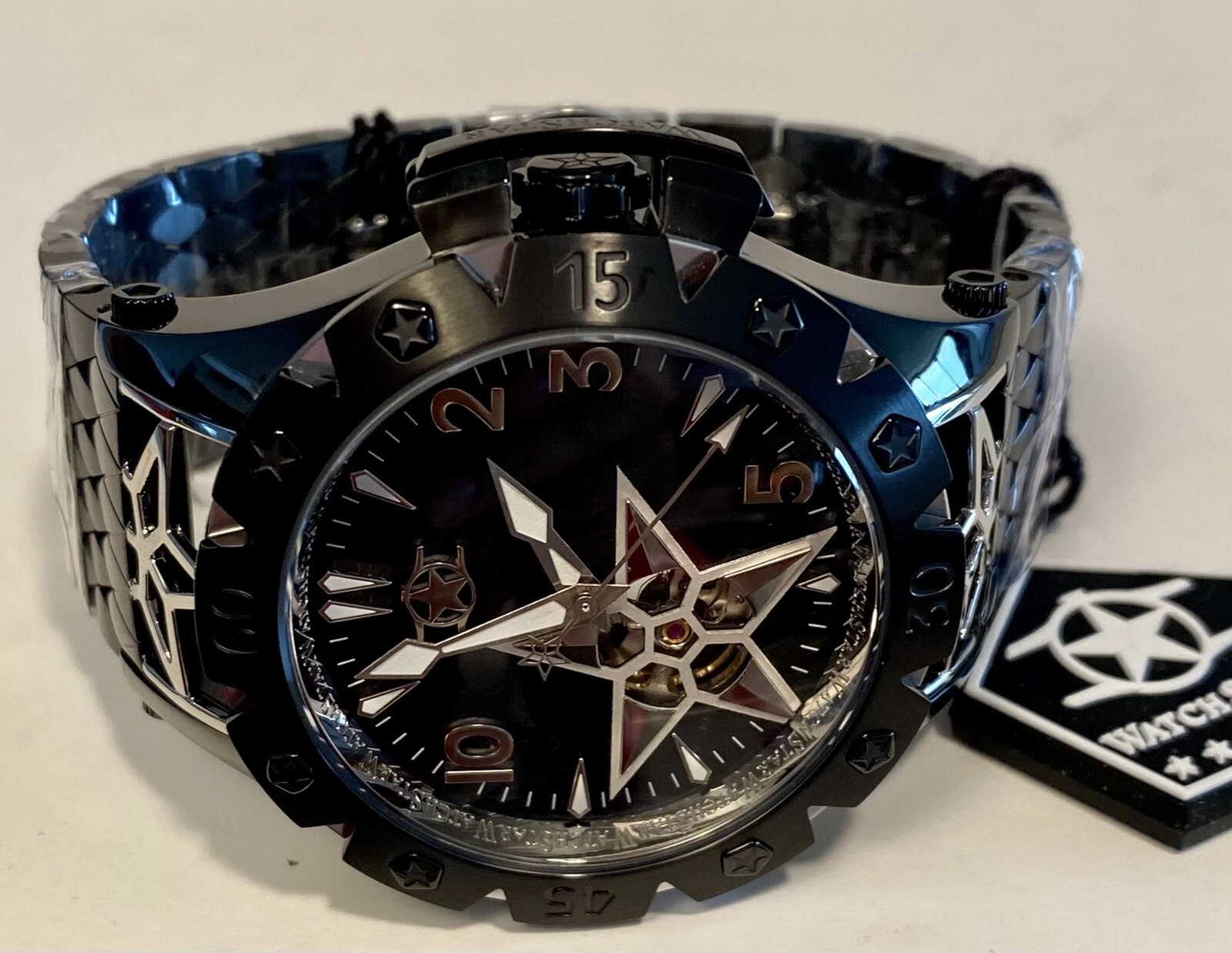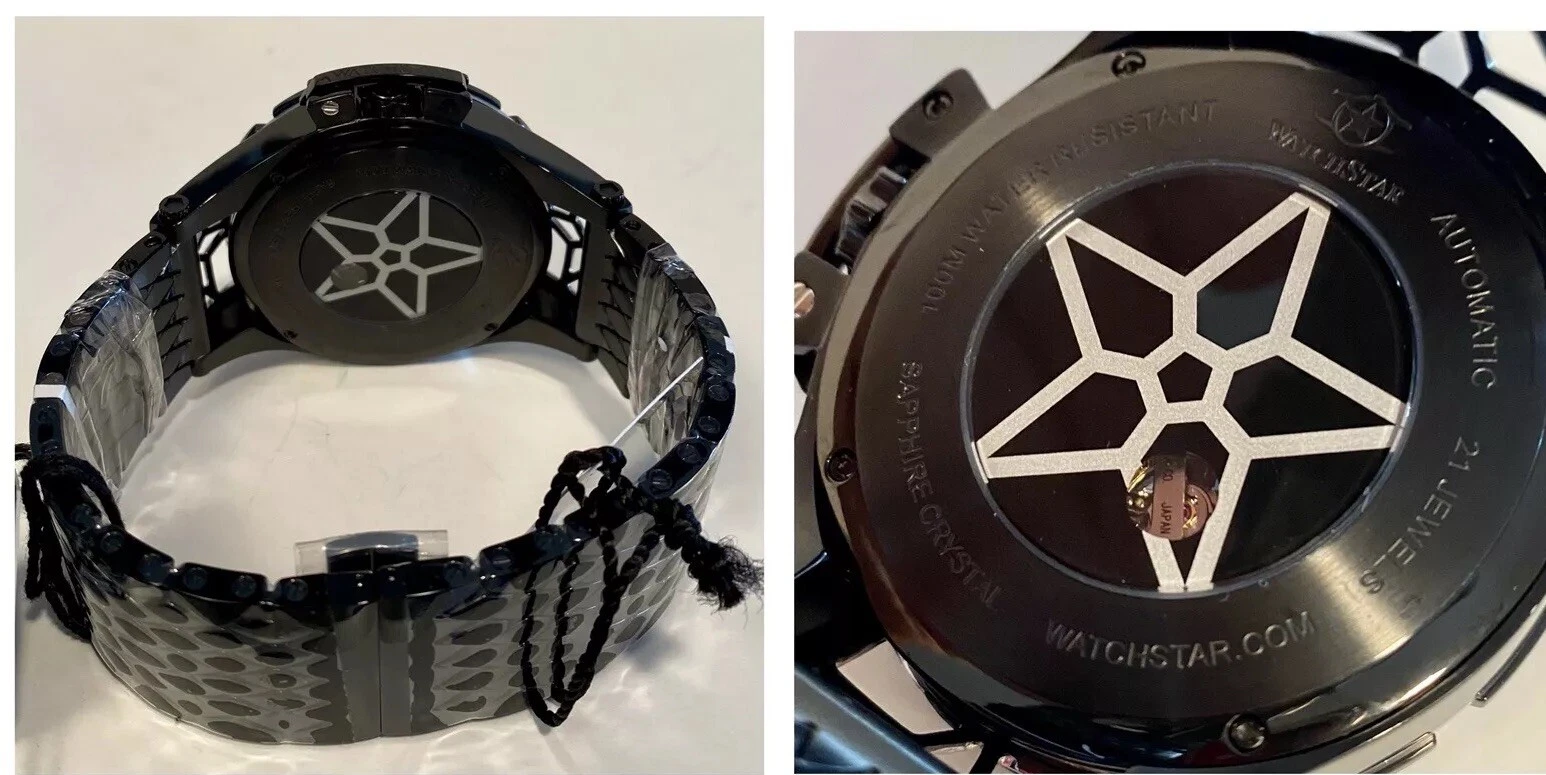 48mm Auto AMERICAN STAR Black 6-Diamond Link Bracelet WatchStar Mens Watch