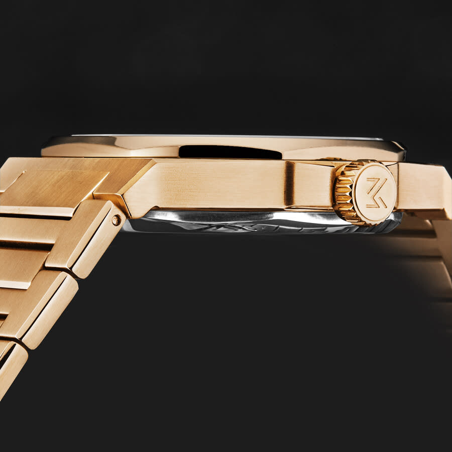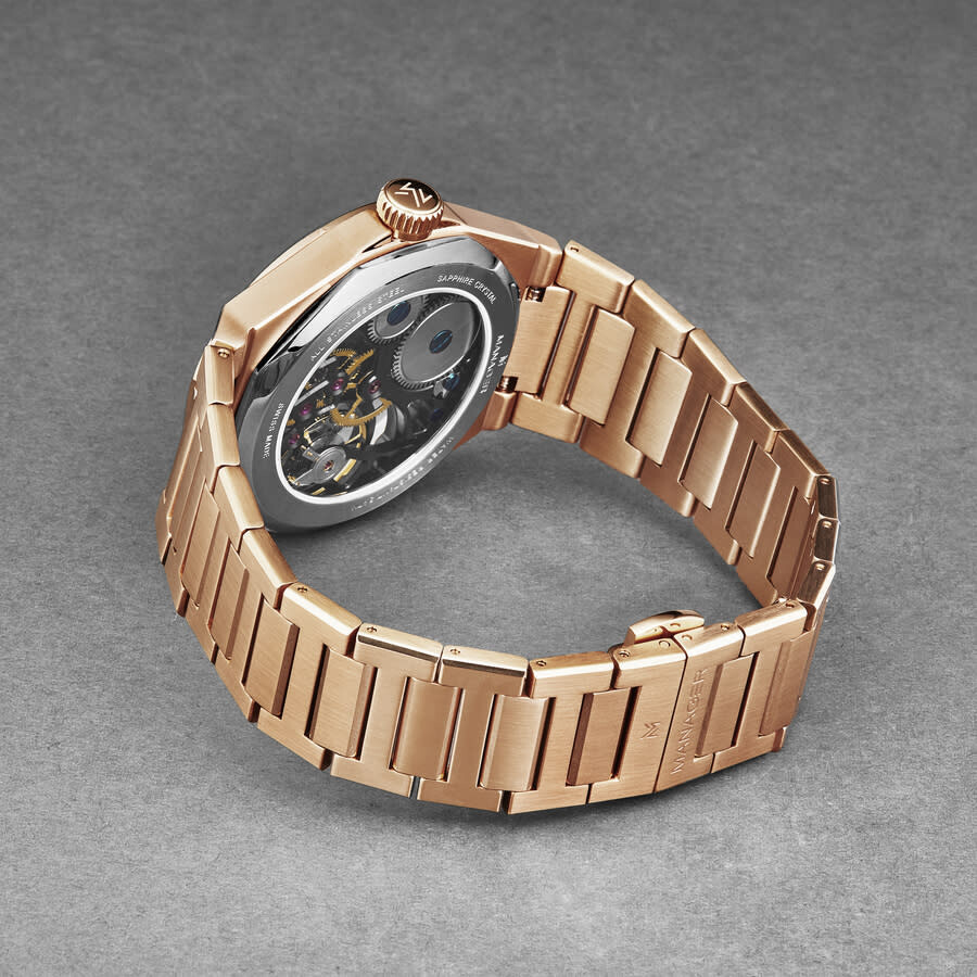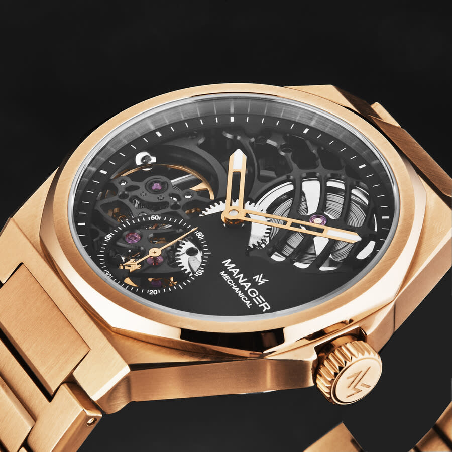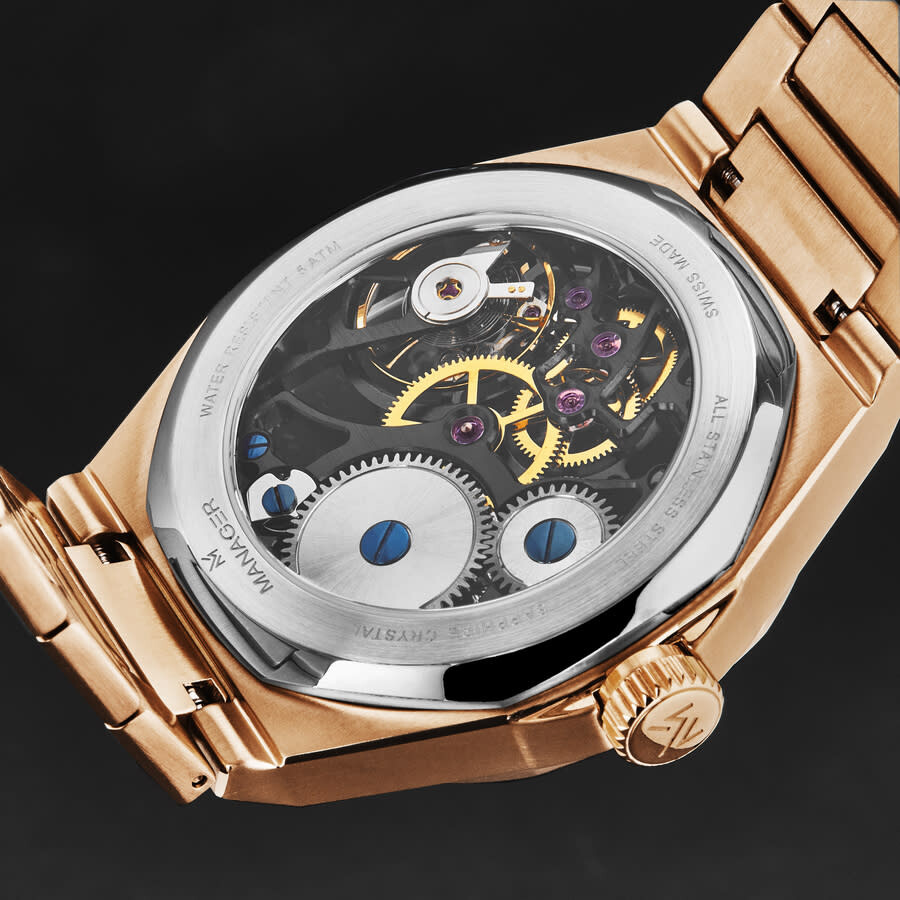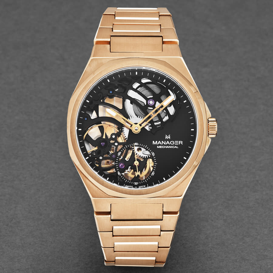 Rose gold-tone stainless steel case and bracelet. Fixed rose gold-tone stainless steel bezel. Black dial with rose gold-tone hands and index hour markers. Minute markers around the outer rim. Dial Type: Analog. Luminescent hands and markers. Hand wind movement. Scratch resistant sapphire crystal. Pull / push crown. Transparent case back. Round case shape, case size: 44 mm, case thickness: 11 mm. Band width: 26 mm, band length: 8 inches. Deployment with push button release clasp. Water resistant at 50 meters / 165 feet. Functions: hour, minute, second. Additional Info: hour, minute + small decentered second. Revolution Series. Luxury watch style. Watch label: Swiss Made. Manager Revolution Hand Wind Black Dial Men's Watch MAN-RM-09-RM.
