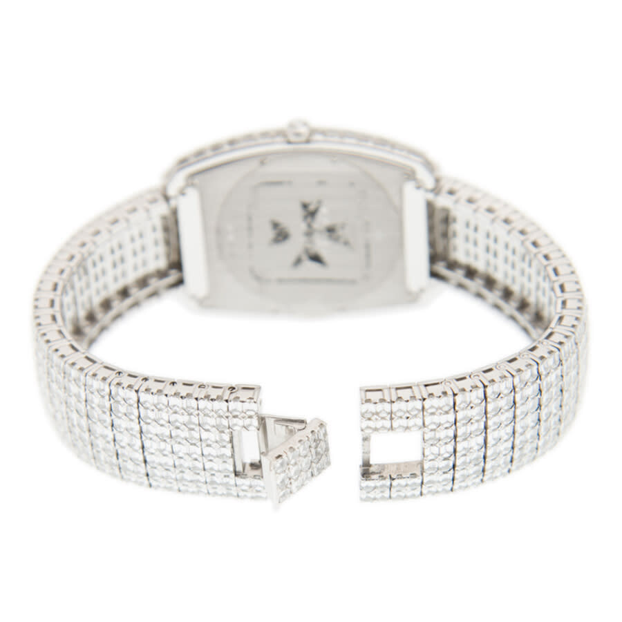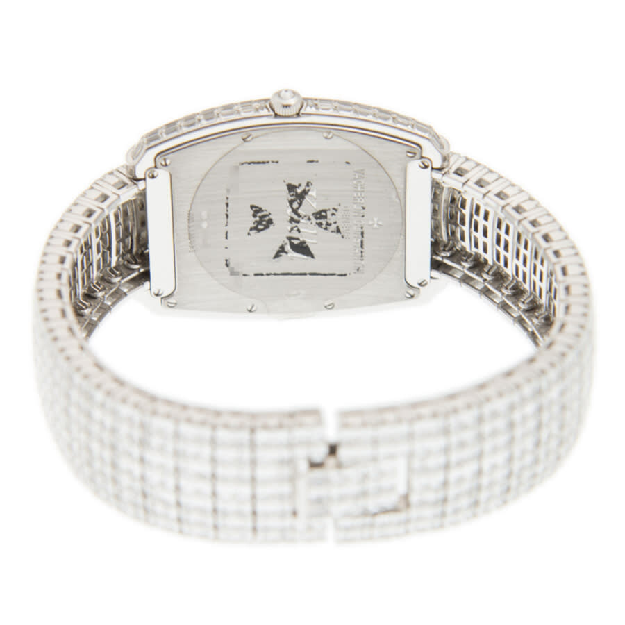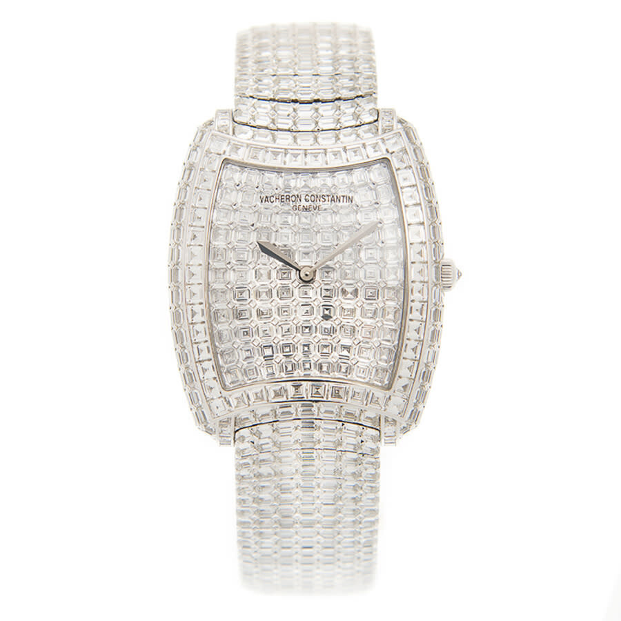 18kt white gold with 182 pcs baguette diamonds case with a silver-tone 18k white gold with diamonds bracelet. Fixed 18k white gold bezel with diamond set. Diamond dial with white hands and diamond hour markers. Dial Type: Analog. Vacheron Constantin Calibre 1400 Hand Wind movement, containing 20 Jewels, composed of 98 parts, bitting at 28800 vph, and has a power reserve of approximately 40 hours. Scratch resistant sapphire crystal. Screw down crown. Solid case back. Unique case shape, case size: 45 x 36 mm, case thickness: 11 mm. Deployment clasp. Functions: hour, minute. Metiers D'art Series. Luxury watch style. Watch label: Swiss Made. Vacheron Constantin Metiers dArt Hand Wind Diamond Ladies Watch 81750/S01G-9198.
