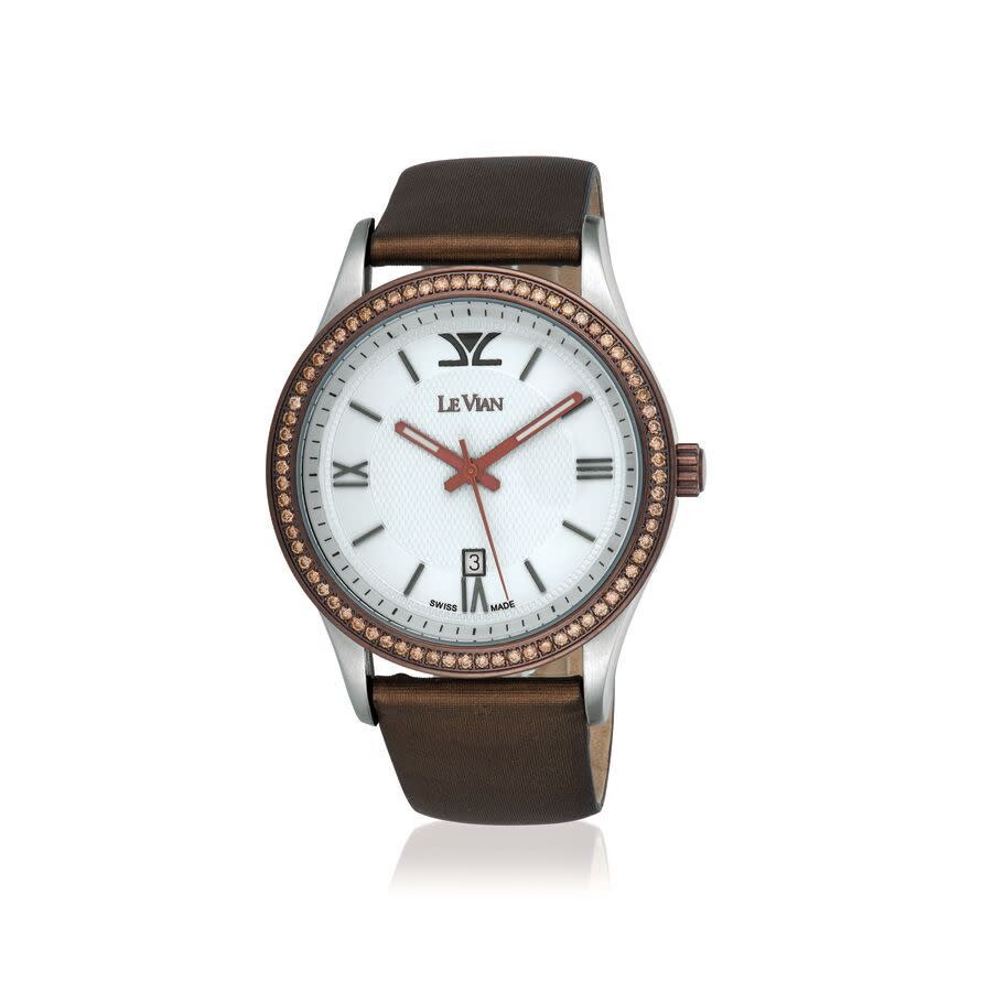 Silver-tone stainless steel case with a brown leather strap. Fixed brown bezel with chocolate diamond set stainless steel. White dial with brown hands and Roman numeral & index hour markers. Minute markers around the outer rim. Dial Type: Analog. Luminescent hands. Date display at the 6 o'clock position. Quartz movement. Round case shape, case size: 22 mm. Buckle clasp. Functions: date, hour, minute, second. Additional Info: 1 1/5 cts. chocolate diamond. Classico Series. Fashion watch style. Watch label: Swiss Made. Le Vian Classico Quartz Diamond White Dial Ladies Watch LV876BRSV.