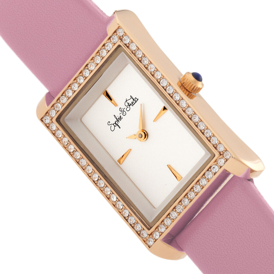 Rose gold-tone alloy case with a pink stainless steel bracelet. Fixed rose gold-tone swarovski crystal set bezel. Silver-tone dial with rose gold-tone hands and index hour markers. Dial Type: Analog. Quartz movement. Scratch resistant mineral crystal. Pull / push jewel-tipped crown. Solid case back. Rectangle case shape, case size: 25 mm, case thickness: 8 mm. Band width: 18 mm. Push button deployment clasp. Water resistant at 30 meters / 100 feet. Functions: hour, minute. Dress watch style. Watch label: Japan Movt. Item Variations: SAFSF5606. Sophie And Freda Wilmington Quartz Crystal Silver Dial Ladies Watch SF5606.