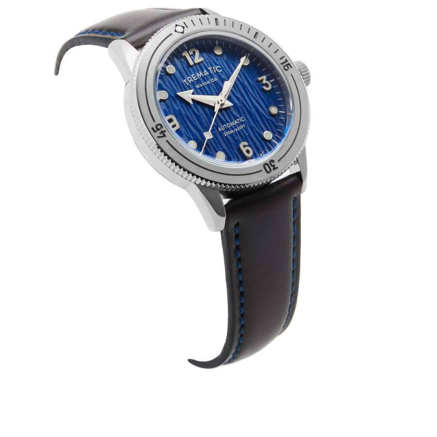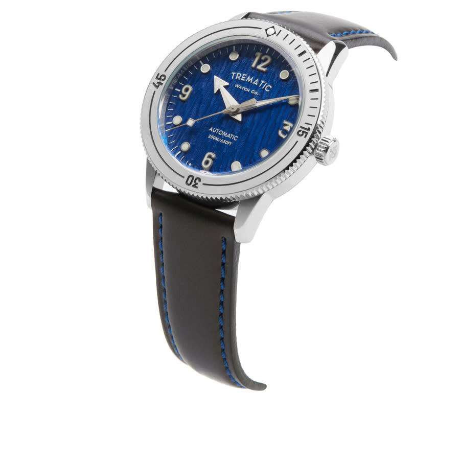 Silver-tone stainless steel case with a black vegan leather strap. Silver-tone tungsten bezel. Blue dial with silver-tone hands and Arabic numeral & index hour markers. Minute markers around the outer rim. Dial Type: Analog. Luminescent hands and markers. Sellita Caliber SW 200 Automatic movement, based upon ETA 2824-2, containing 26 Jewels, bitting at 28800 vph, and has a power reserve of approximately 38 hours. Scratch resistant sapphire crystal. Screw down crown. Solid case back. Round case shape, case size: 39 mm, case thickness: 12 mm. Band width: 20 mm. Water resistant at 200 meters / 660 feet. Functions: hour, minute, second. Ac 14 Series. Luxury watch style. Watch label: Swiss Made. Trematic Ac 14 Automatic Blue Dial Men's Watch 1415121.