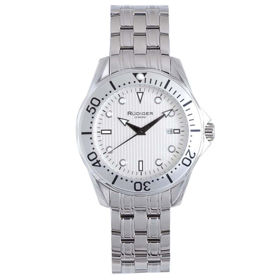 Silver-tone stainless steel case with a silver stainless steel bracelet. Unidirectional rotating silver-tone stainless steel bezel. White dial with black hands and index hour markers. Minute markers around the outer rim. Dial Type: Analog. Date display at the 3 o'clock position. Quartz movement. Scratch resistant mineral crystal. Push/pull crown. Solid case back. Round case shape, case size: 42 mm, case thickness: 11.5 mm. Band width: 20 mm, band length: 8.5 in. Fold over clasp. Water resistant at 50 meters / 165 feet. Functions: date, hour, minute, second. Casual watch style. Rudiger Chemnitz White Dial Men's Watch R2000-04-001.1.
