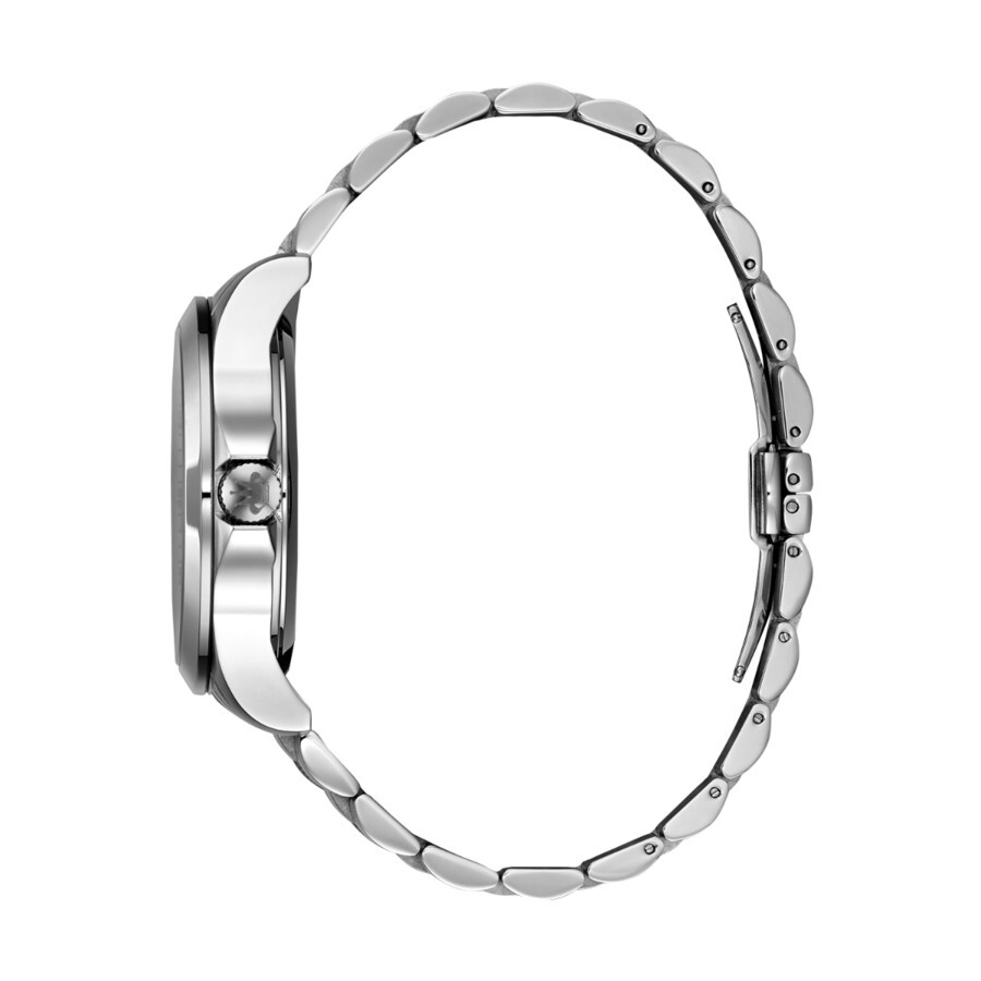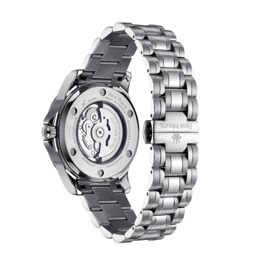 Silver-tone stainless steel case and bracelet. Fixed silver-tone stainless steel bezel. Brown dial with silver-tone hands and Arabic numeral & index hour markers. Minute scale around the inner rim. Dial Type: Analog. Luminescent hands and markers. Date display at the 3 o'clock position. 24 hour subdials. Automatic movement. Scratch resistant mineral crystal. Pull / push crown. Transparent case back. Round case shape, case size: 44 mm, case thickness: 13 mm. Band width: 22 mm, band length: 7.87 inches. Deployment with push button release clasp. Water resistant at 100 meters / 330 feet. Functions: hour, minute, second, power reserve. Cygnus Series. Dress watch style. Rene Mouris Cygnus Automatic Brown Dial Men's Watch 70104RM3.