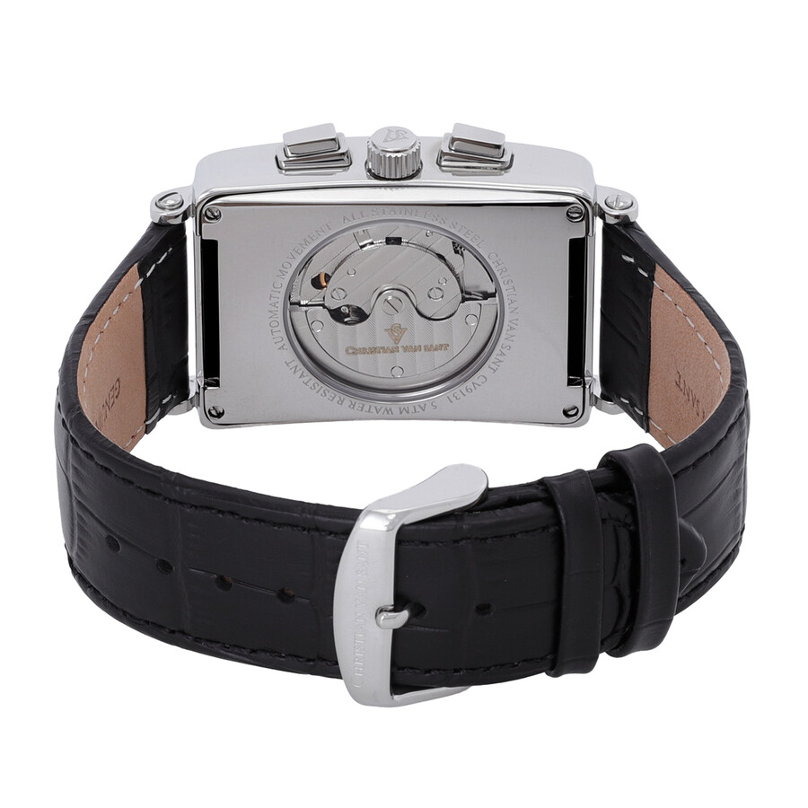 Silver-tone stainless steel case with a black leather strap. Fixed silver-tone stainless steel bezel. White dial with blue hands and index hour markers. Minute markers around the outer rim. Dial Type: Analog. Date display between 4 and 5 o'clock position. Automatic movement. Scratch resistant mineral crystal. Rectangle case shape, case size: 52 mm. Band width: 23 mm. Buckle clasp. Water resistant at 50 meters / 165 feet. Functions: month, date, day, hour, minute, second. Prodigy Series. Fashion watch style. Christian Van Sant Prodigy Automatic White Dial Men's Watch CV9131.